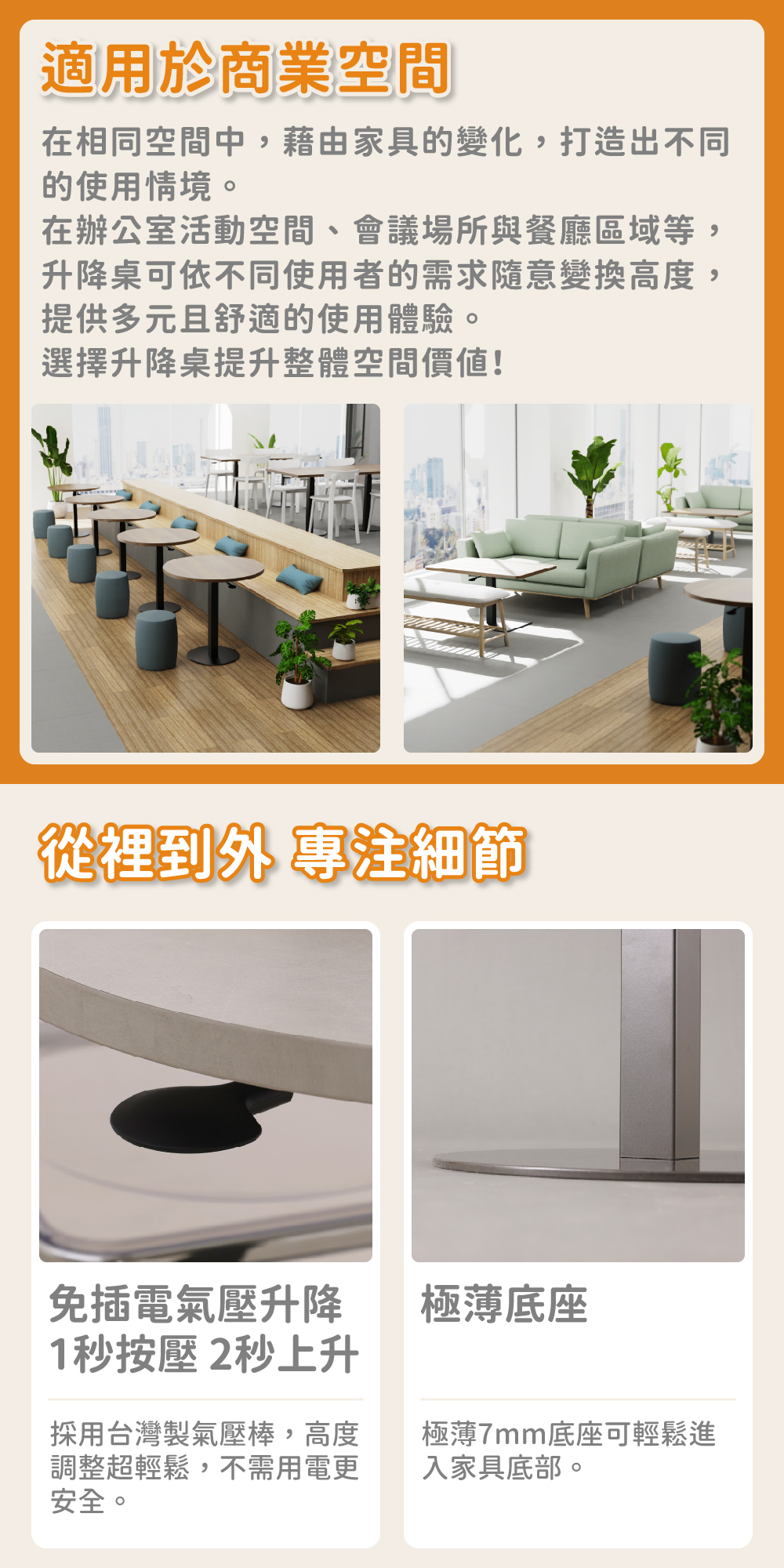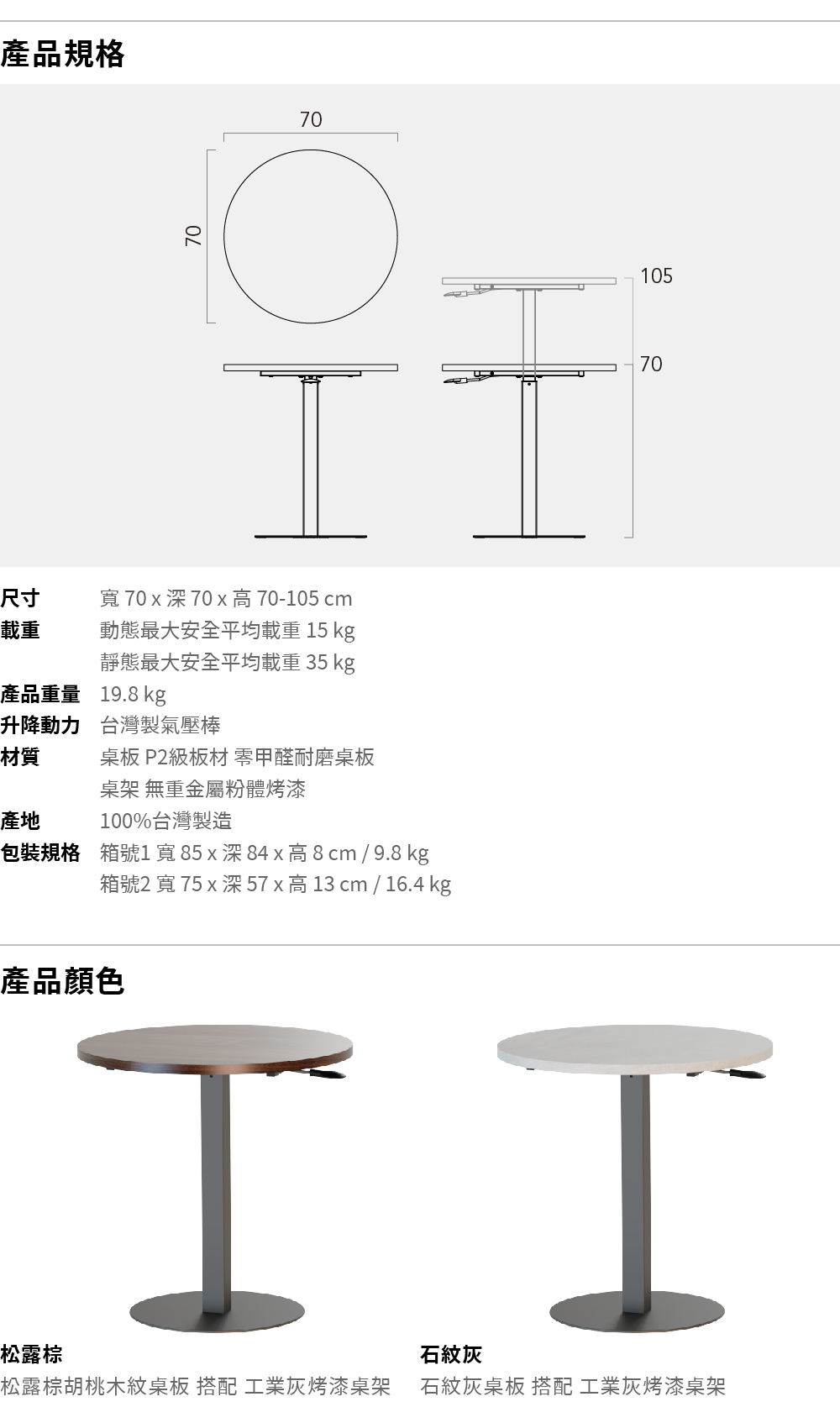 尺寸 寬 70 x 深 70 x 高 70-105 cm載重 動態最大安全平均載重 15 kg 靜態最大安全平均載重 35 kg產品重量 19.8 kg升降動力 臺灣製氣壓棒材質 桌板 P2級板材 零甲醛耐磨美耐皿板 厚度 2.5 cm 桌架 無重金屬粉體烤漆塗裝產地 100%臺灣製造包裝規格 箱號1 寬 85 x 深 84 x 高 8 cm / 9.8 kg 箱號2 寬 75 x 深 57 x 高 13 cm / 16.4 kg