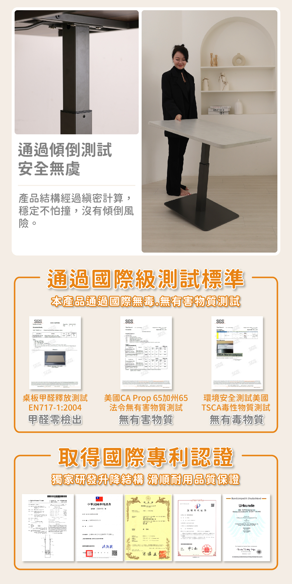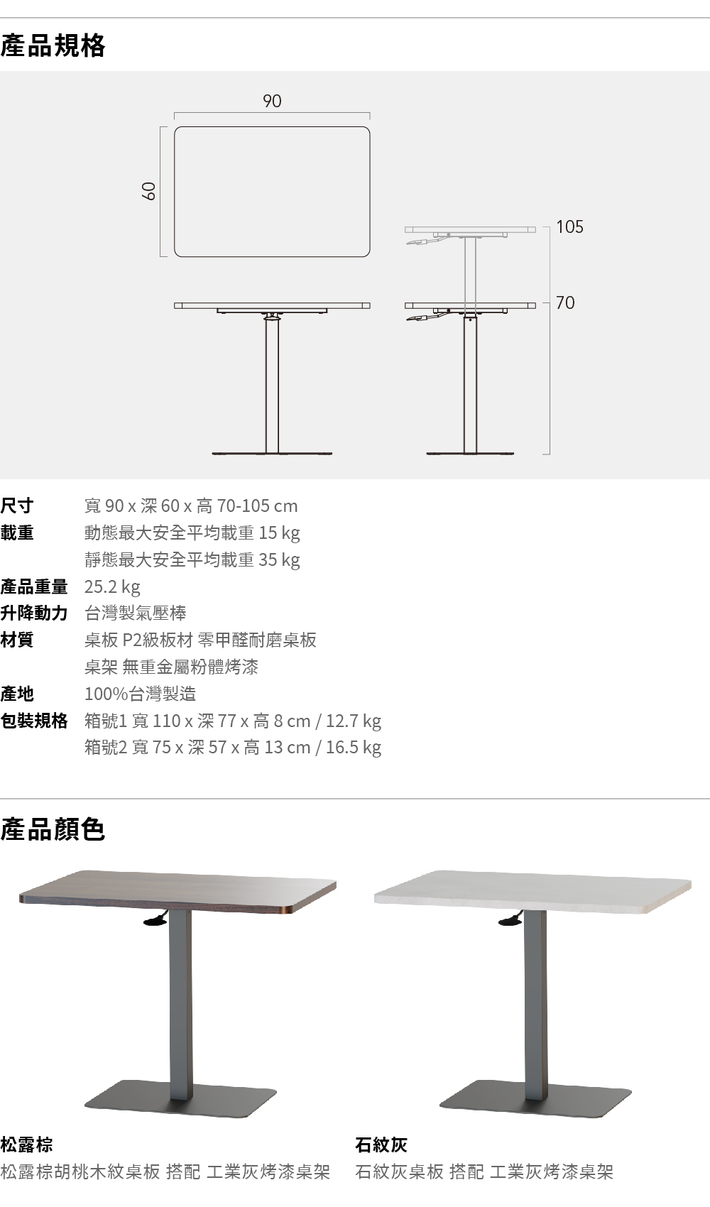 尺寸 寬 90 x 深 60 x 高 70-105 cm載重 動態最大安全平均載重 15 kg 靜態最大安全平均載重 35 kg產品重量 25.2 kg升降動力 臺灣製氣壓棒材質 桌板 P2級板材 零甲醛耐磨美耐皿板 厚度 2.5 cm 桌架 無重金屬粉體烤漆塗裝產地 100%臺灣製造包裝規格 箱號1 寬 110 x 深 77 x 高 8 cm / 12.7 kg 箱號2 寬 75 x 深 57 x 高 13 cm / 16.5 kg