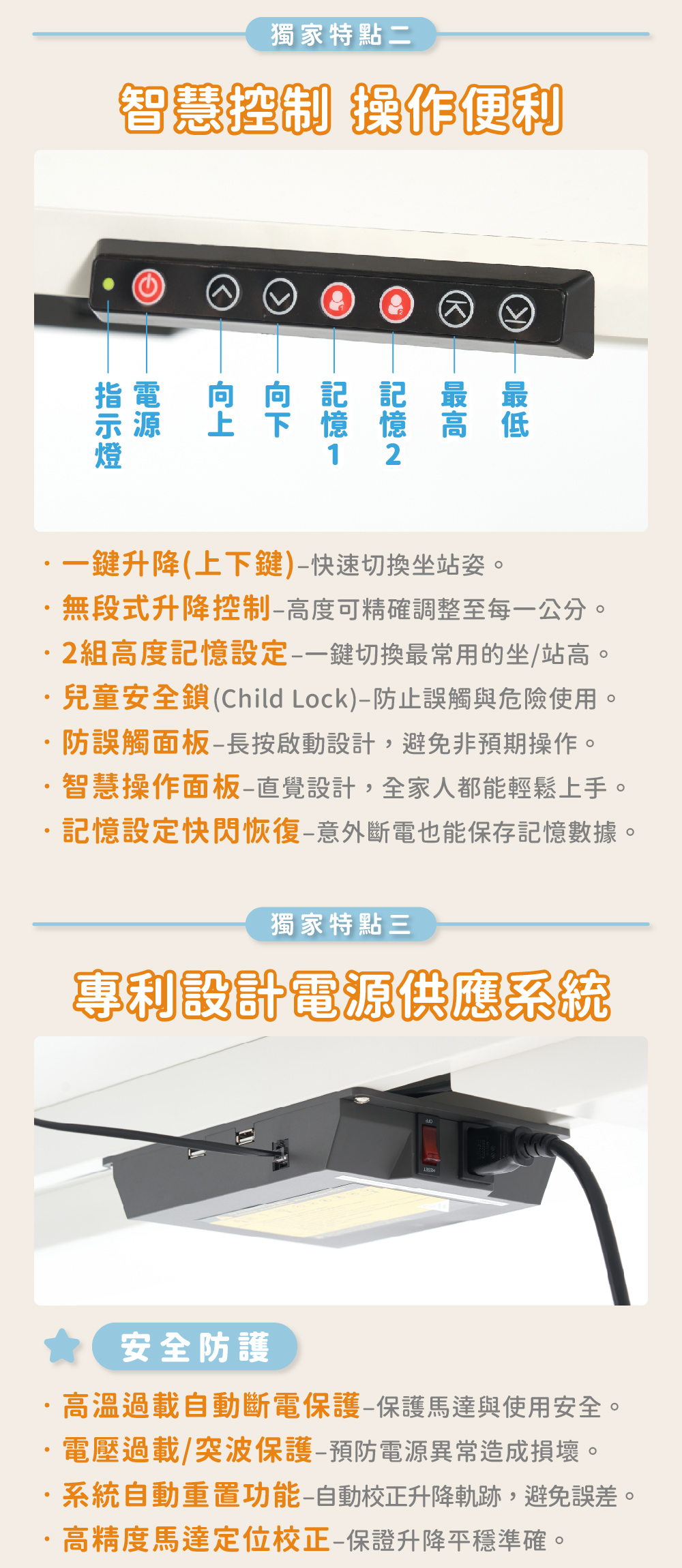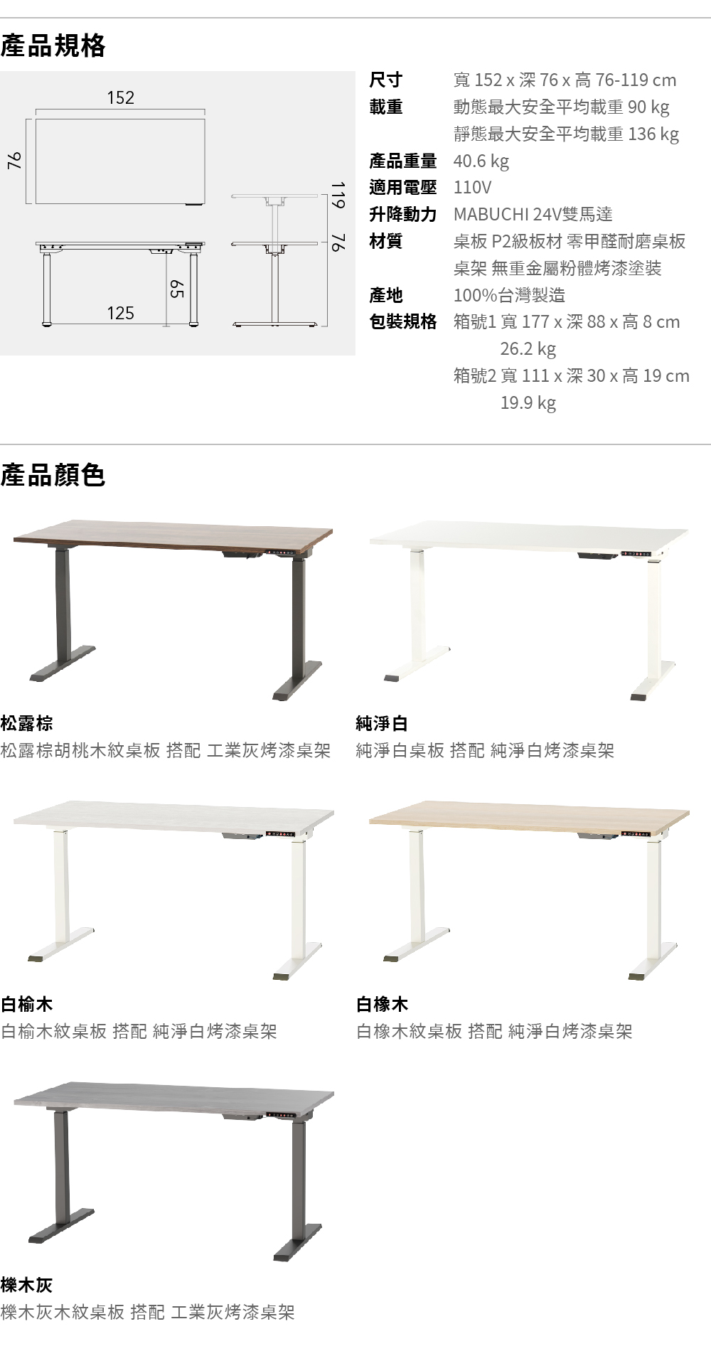 尺寸 寬 152 x 深 76 x 高 76-119 cm 載重 動態最大安全平均載重 90 kg 靜態最大安全平均載重 136 kg 產品重量 40.6 kg 適用電壓 110V 升降動力 日本 MABUCHI 24V 雙馬達 材質 桌板 P2級板材 零甲醛耐磨美耐皿板 厚度 2.5 cm 桌架 無重金屬粉體烤漆塗裝 產地 100%臺灣製造 包裝規格 箱號1 寬 177 x 深 88 x 高 8 cm / 26.2 kg 箱號2 寬 111 x 深 30 x 高 19 cm / 19.9 kg