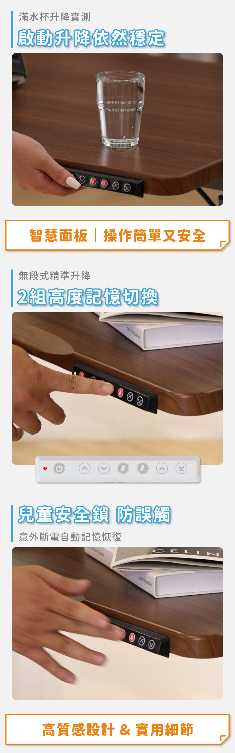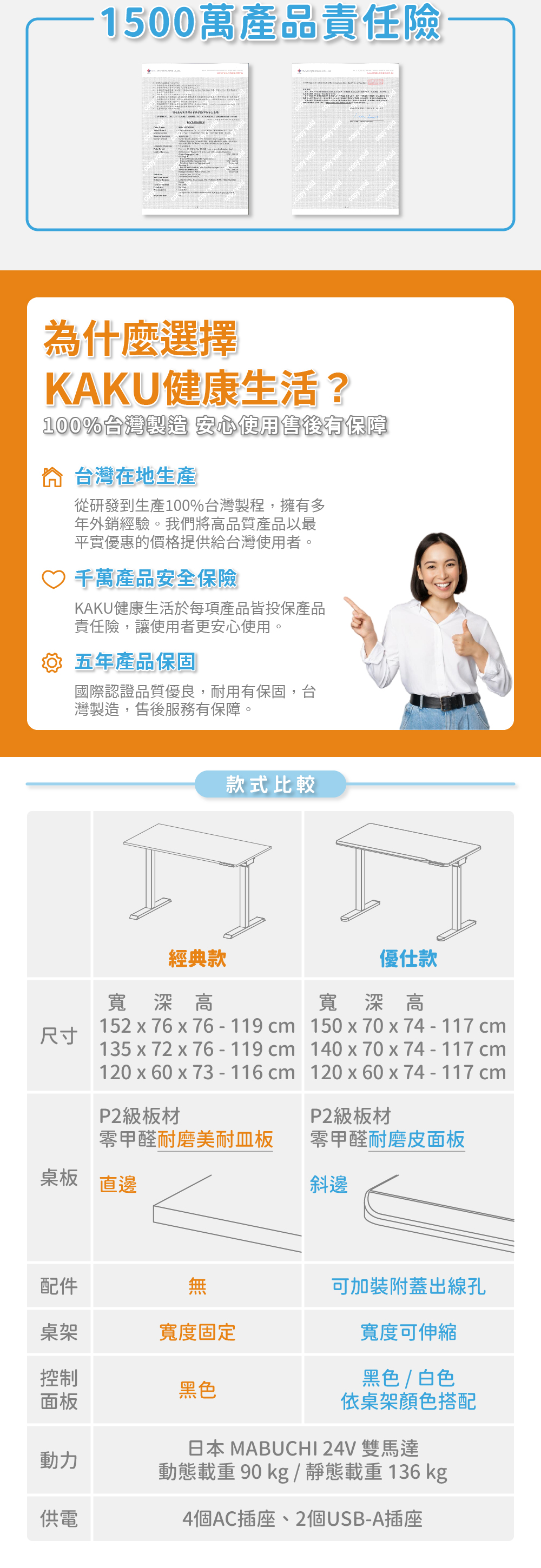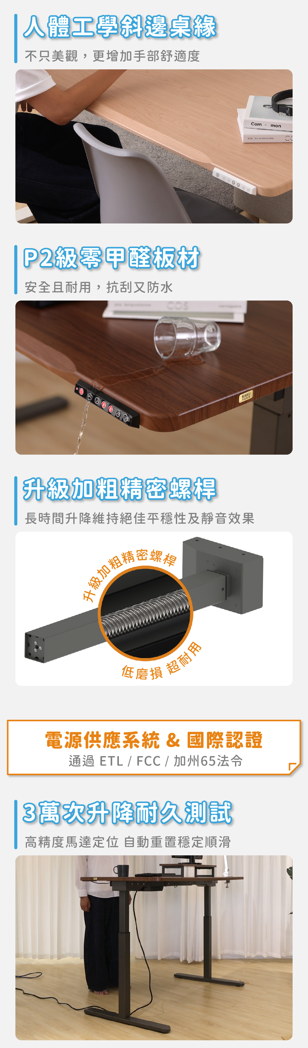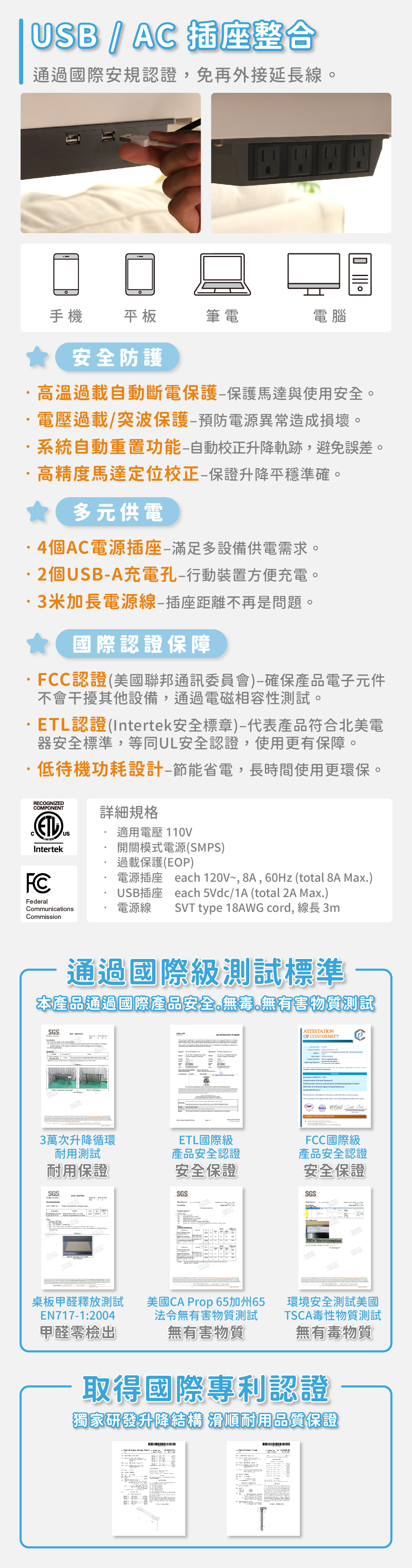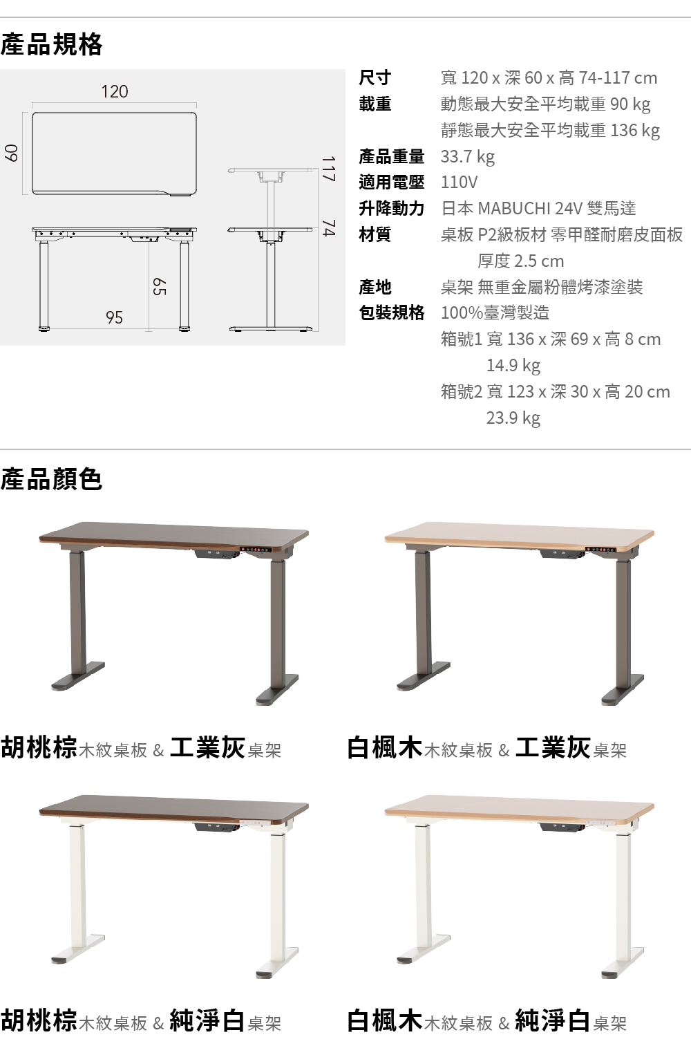 尺寸 寬 120 x 深 60 x 高 74-117 cm載重 動態最大安全平均載重 90 kg 靜態最大安全平均載重 136 kg產品重量 33.7 kg適用電壓 110V升降動力 日本 MABUCHI 24V 雙馬達材質 桌板 P2級板材 零甲醛耐磨皮面板 厚度 2.5 cm 桌架 無重金屬粉體烤漆塗裝產地 100%臺灣製造包裝規格 箱號1 寬 136 x 深 69 x 高 8 cm / 14.9 kg 箱號2 寬 123 x 深 30 x 高 20 cm / 23.9 kg