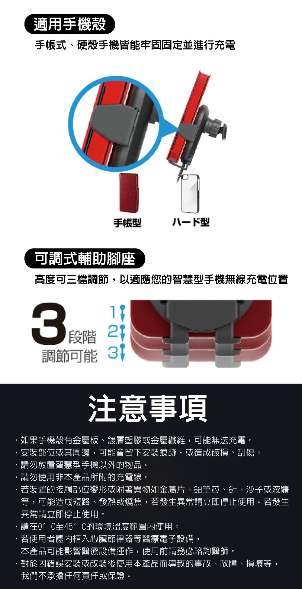 注意事項‧本產品不包含USB電源供應器。需要使用額定功率為5V2A或更高,或支援QC 2.0或更高版本的USB電源轉接器。如果使用額定功率較低的USB電源轉接器,充電時間可能會延長。‧根據手機殼的材質和厚度,可能無法充電。‧如果手機殼有金屬板、鍍層塑膠或金屬纖維,可能無法充電。‧安裝部位或其周邊,可能會留下安裝痕跡,或造成破損、刮傷。‧若智慧型手機保護殼過於厚重,可能會無法充電。‧本產品僅限放置符合 Qi 規格 的裝置(智慧型手機)。‧請勿放置智慧型手機以外的物品。‧請勿使用非本產品所附的充電線。‧請勿將產品安裝在可能影響駕駛或可能影響安全裝置(安全氣囊、安全帶等)有效性的地方。‧請勿改裝本產品,否則可能會導致故障。‧若裝置的接觸部位變形或附著異物如金屬片、鉛筆芯、針、沙子或液體等,可能造成短路、發熱或燒焦,若發生異常請立即停止使用。若發生異常請立即停止使用。‧請於孩童無法觸及之處使用與保管。‧使用中若出現異味、冒煙、異常發熱等狀況,請立即停止使用。‧請在0°C至45°C的環境溫度範圍內使用。‧若使用者體內植入心臟節律器等醫療電子設備,本產品可能影響醫療設備運作,使用前請務必諮詢醫師。‧對於因錯誤安裝或改裝後使用本產品而導致的事故、故障、損壞等,我們不承擔任何責任或保證。