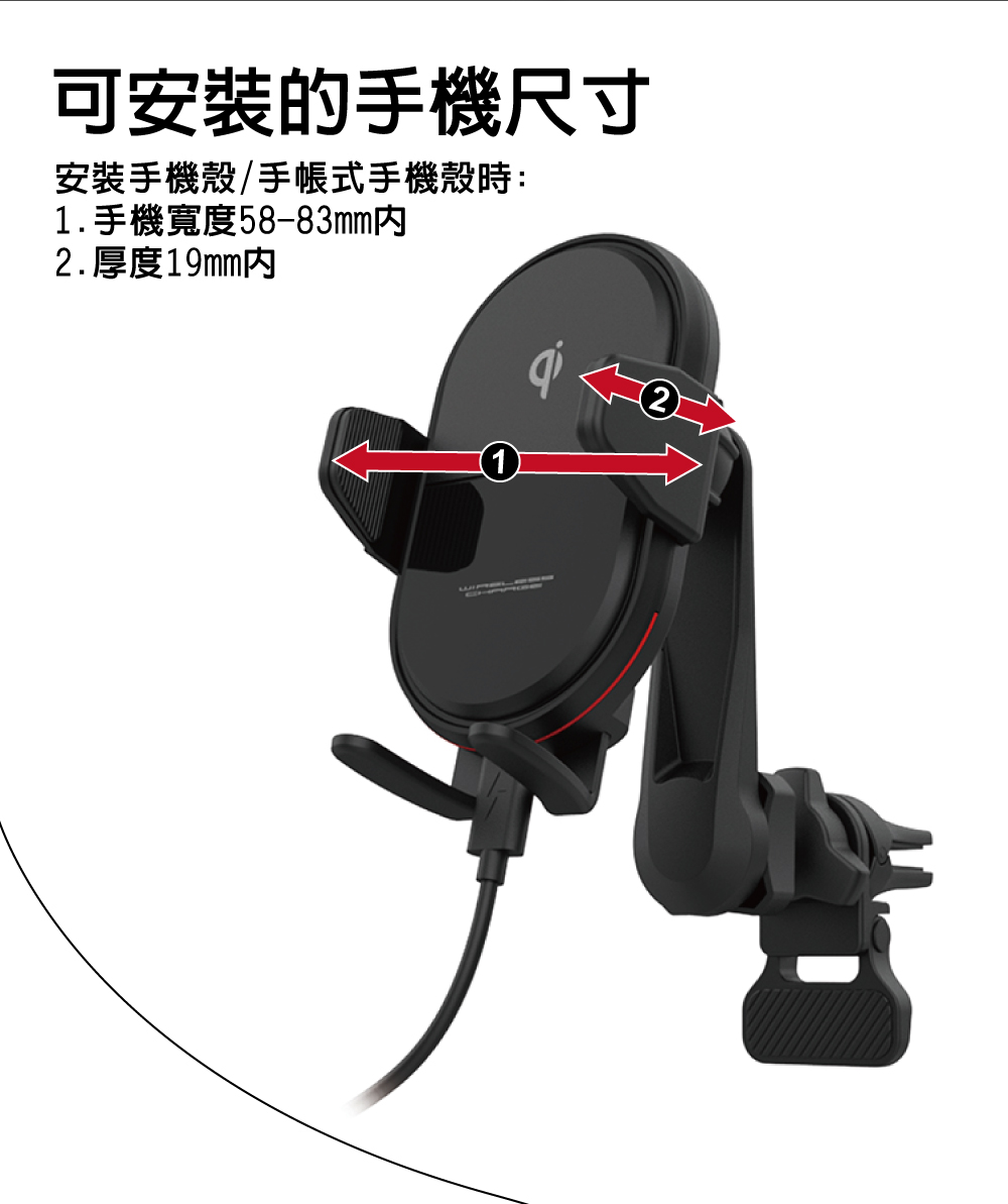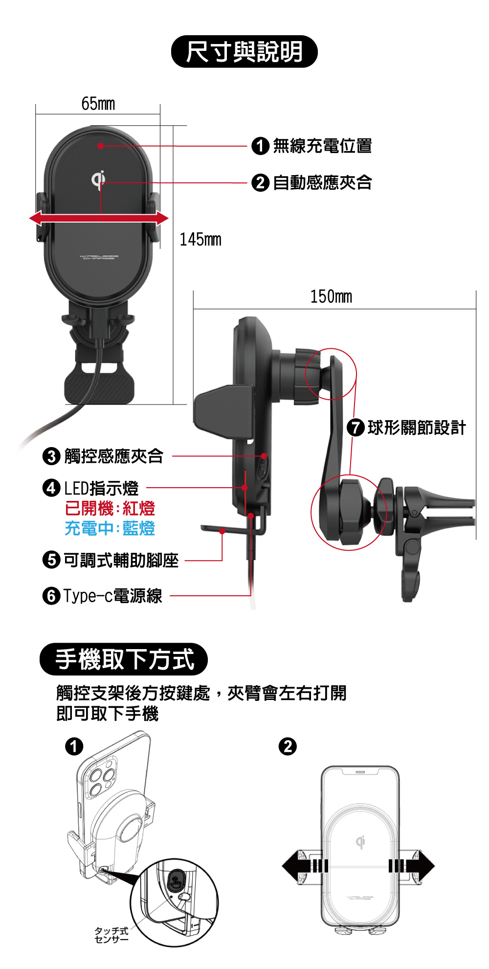 商品介紹.台灣經濟部BSMI合格認證商品,安心有保障。.通過無線充電標準Qi規範。.急速快充15W,穩定供電。(快速充電需要相容的裝置和支援 Quick Charge 2.0 或更高版本的 USB 電源).請安裝於冷氣口。.全自動感應夾合手機並同時充電,一鍵觸摸開啟即可拿取手機。.內建電容器,電力預留設計,即使引擎熄火後仍可電動開合多次進行解鎖。.加長型支架設計,避開冷氣出風口、避免干擾控制桿。.球形關節設計,手機角度可360度調整。.手帳式、硬殼手機殼皆能牢固固定並進行充電。.內建LED指示燈(亮紅燈:已開機;閃爍藍燈:正在充電;閃爍紅燈:異常)。.可調式輔助腳座,高度可三檔調節,以適應您的智慧型手機無線充電位置。.內含 USB-C 電源線。*請勿與其他產品同時使用。.安全功能包括:過電流保護、過壓保護、過熱保護和異物偵測。.純正日本品牌,品質保障。