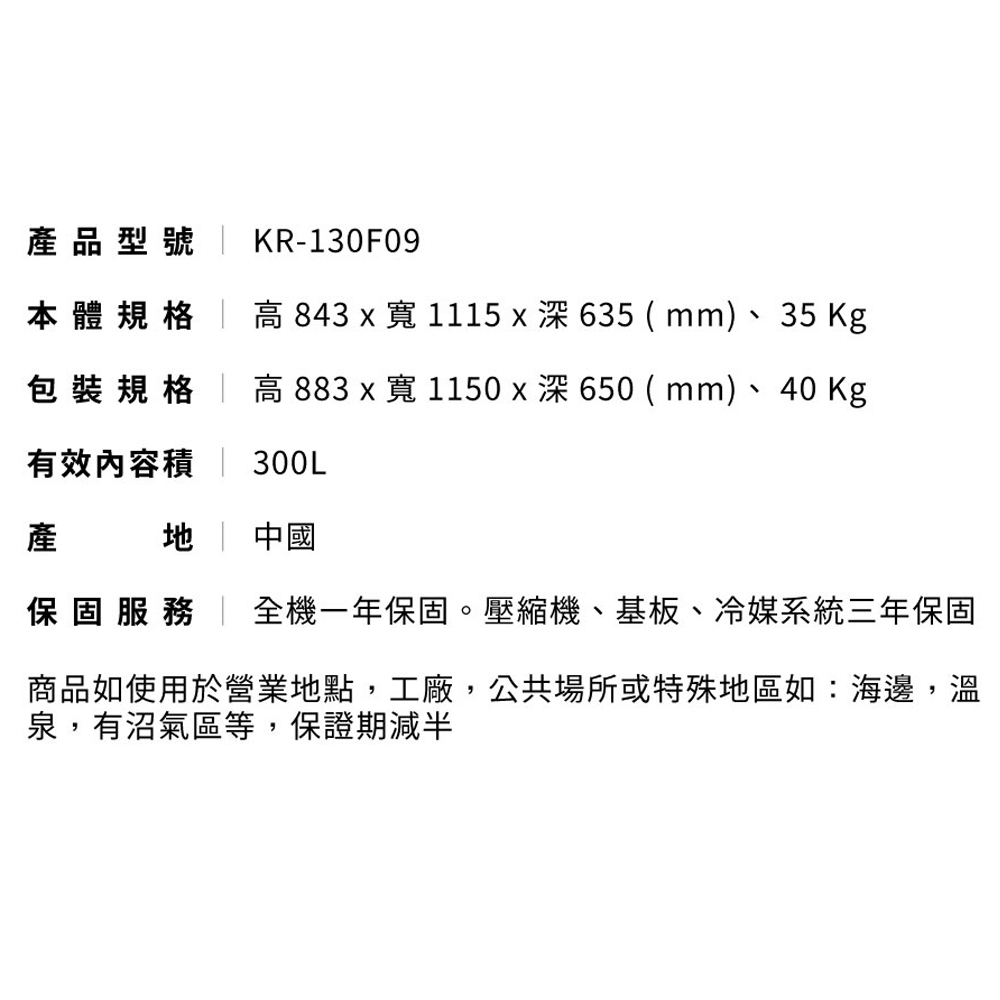 Kolin歌林 300L 臥式冷凍櫃 KR-130F09-W