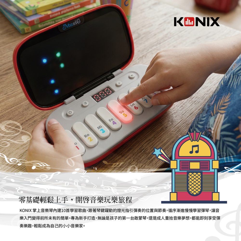 KONIX 口袋琴內建10首學習歌曲,跟著琴鍵躍動的燈光指引彈奏的位置與節奏,循序漸進慢慢學習彈琴,讓音樂入門變得前所未有的簡單。專為新手打造,無論是孩子的第一台啟蒙琴,還是成人重拾音樂夢想,都能即刻享受彈奏樂趣,輕鬆成為自己的小小音樂家。