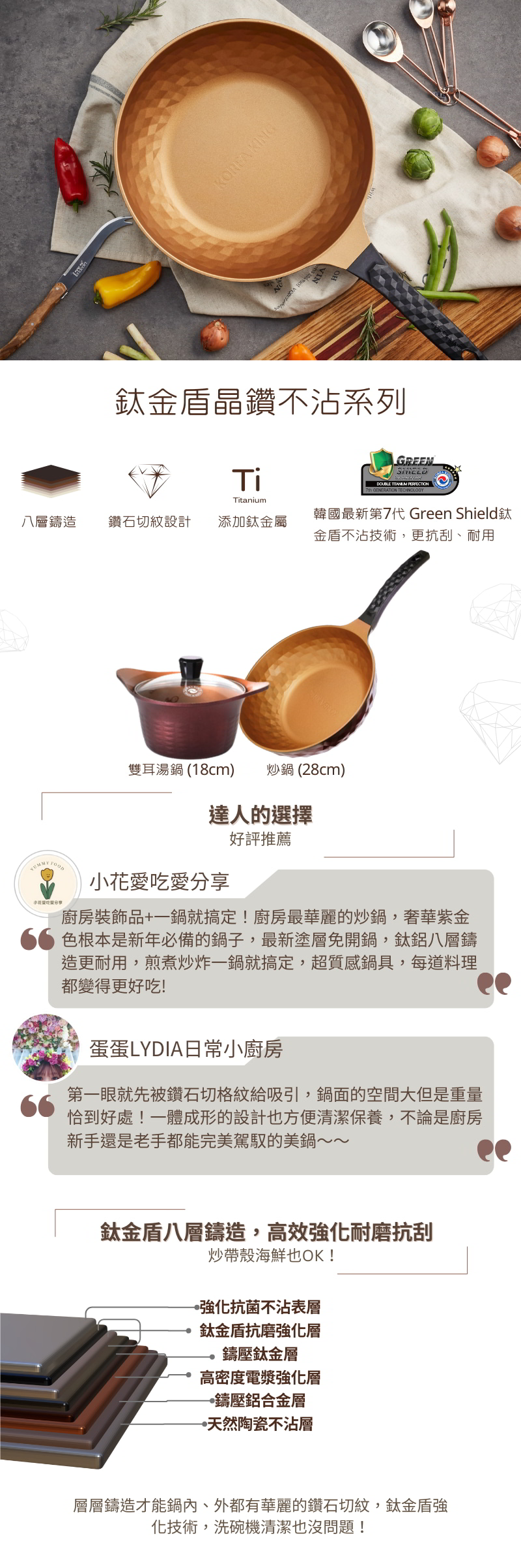 ●極美內外鑽石切割紋,奢華紫金配色 ●使用韓國第七代Green shield鈦金盾不沾技術,鈦鋁八層鍛造鍋身輕巧 ●層層鍛造讓鍋子不沾、抗刮、更耐用. ●適用IH爐、瓦斯爐、電磁爐、黑晶爐等各種爐具,煎煮炒炸料理通通一鍋搞定. ●不含PFAS、PFOA、PFOS,不只好用更安心