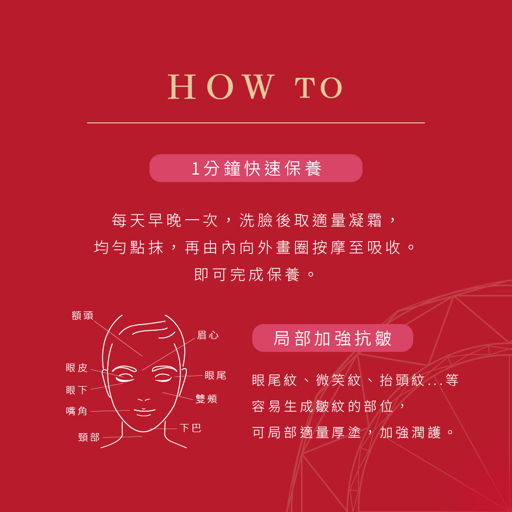 【用途】 深層滋潤並提升彈力,改善乾燥細紋,使肌膚更緊緻柔嫩