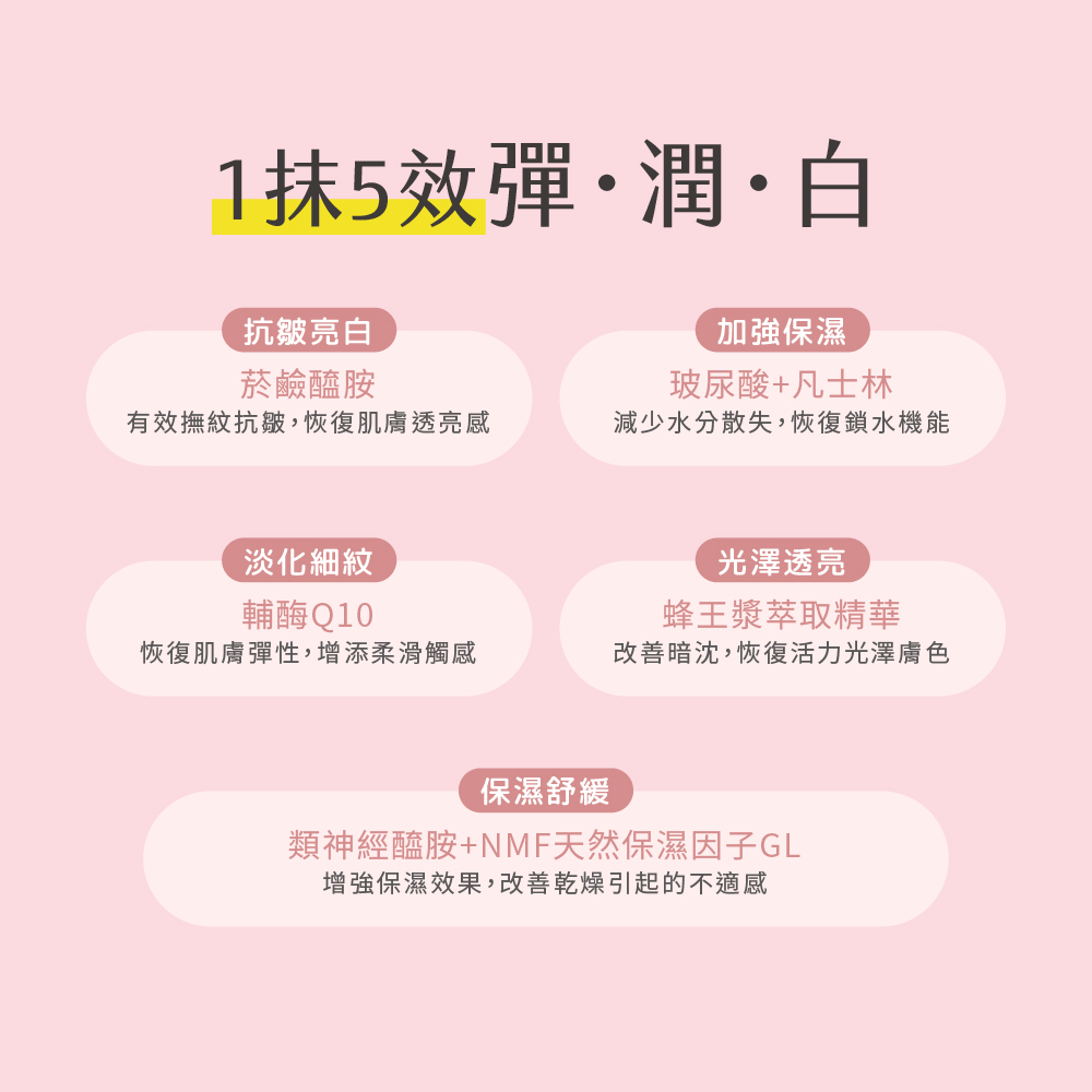 撫紋亮白:添加菸鹼醯胺,有效撫紋,恢復肌膚彈性。