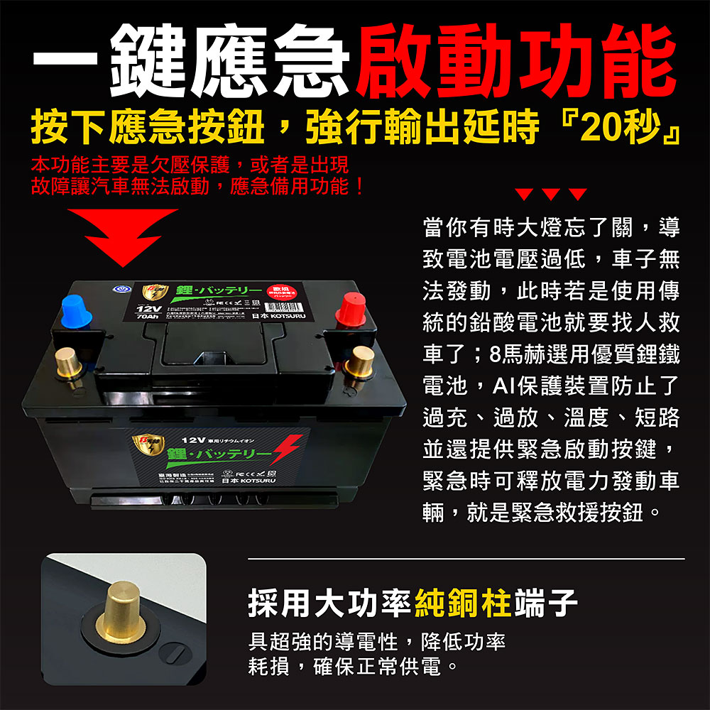 8馬赫汽車鉛轉鋰動力電瓶,生產組裝臺灣,ISO 9001廠,企業以綠能、減碳、永續、責任為目標,生產超高倍率電池,採用最新研發奈米高倍率電芯、能量密度高、重量最輕、電力強勁、啟動電流最強;容量大,使用時間長,為最強悍的綠色能源。