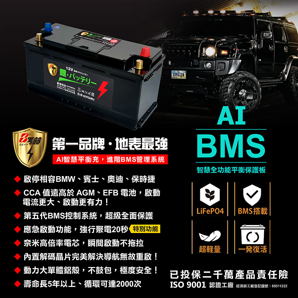 8馬赫汽車鉛轉鋰動力電瓶,生產組裝臺灣,ISO 9001廠,企業以綠能、減碳、永續、責任為目標,生產超高倍率電池,採用最新研發奈米高倍率電芯、能量密度高、重量最輕、電力強勁、啟動電流最強;容量大,使用時間長,為最強悍的綠色能源。