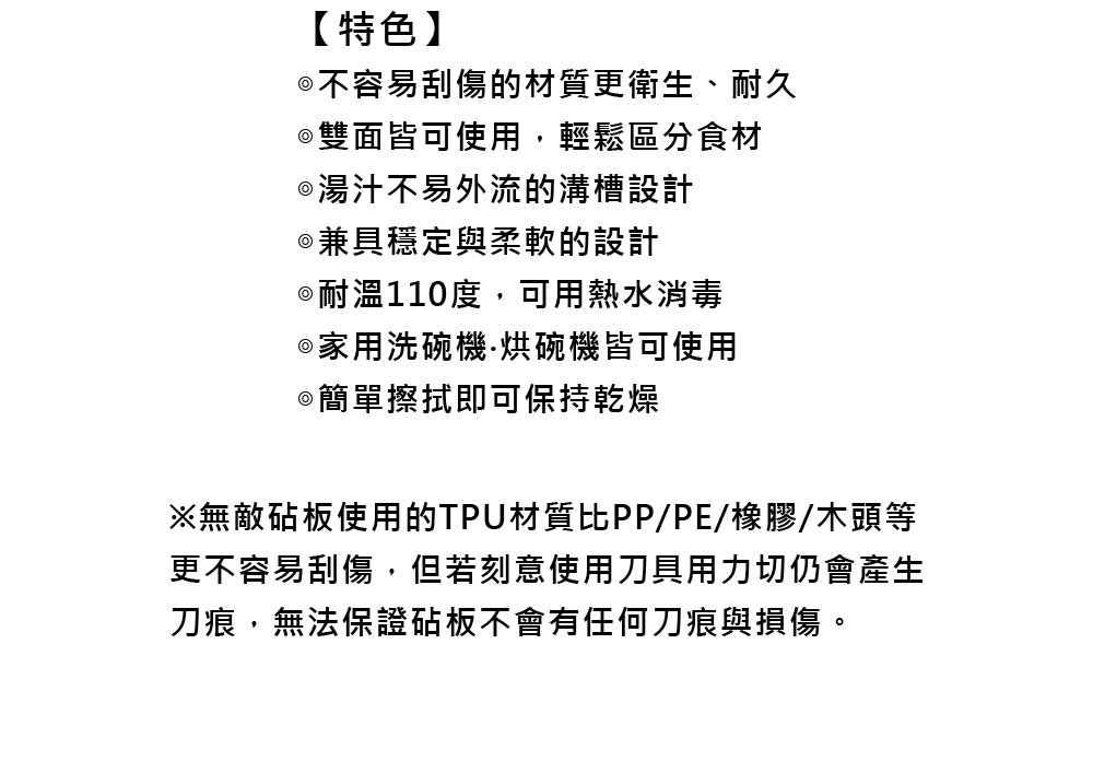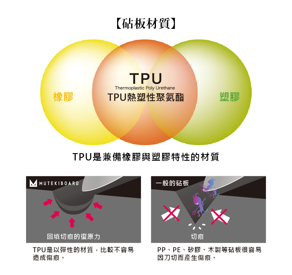 防刮!採用TPU材質製成的菜板,兼具橡膠和塑膠的特性