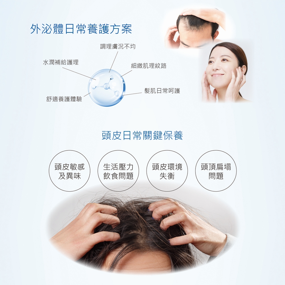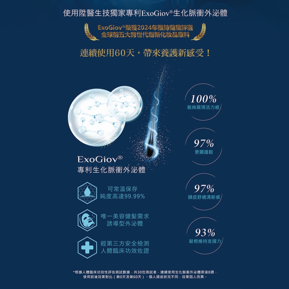 使用陞醫生技獨家專利ExoGiov@生化脈沖外泌體等多重抗老健髮成分,有效強健髮根、滋養頭皮、活絡毛髮。