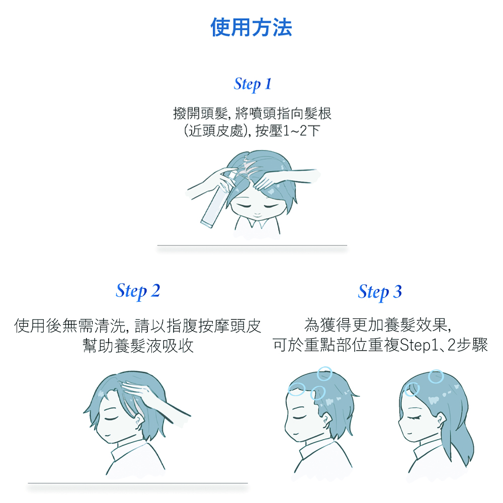 【用法】徹底清潔頭皮後,將噴頭輕抵在需要使用的頭皮部位,並以指腹持續輕壓按摩幫助吸收。