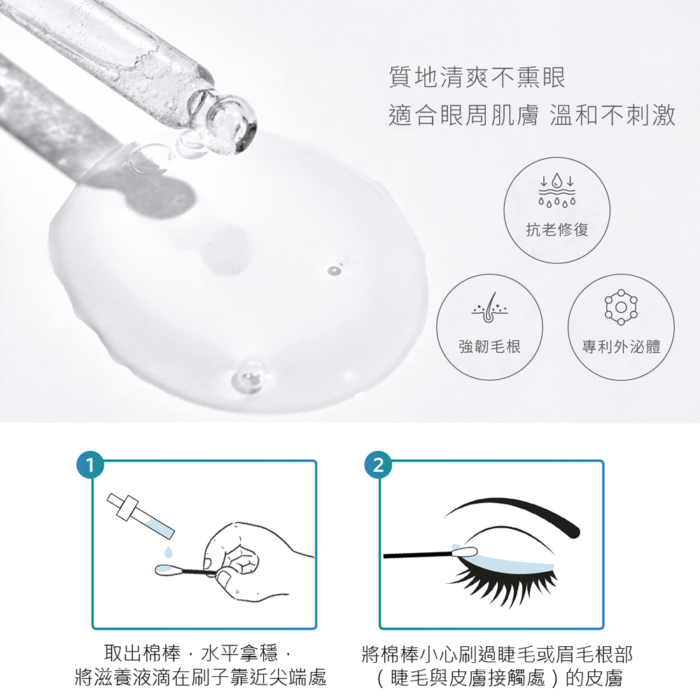 【用法】清潔面部後,用棉棒沾取滋養液,塗抹於上、下睫毛和眉毛的根部。