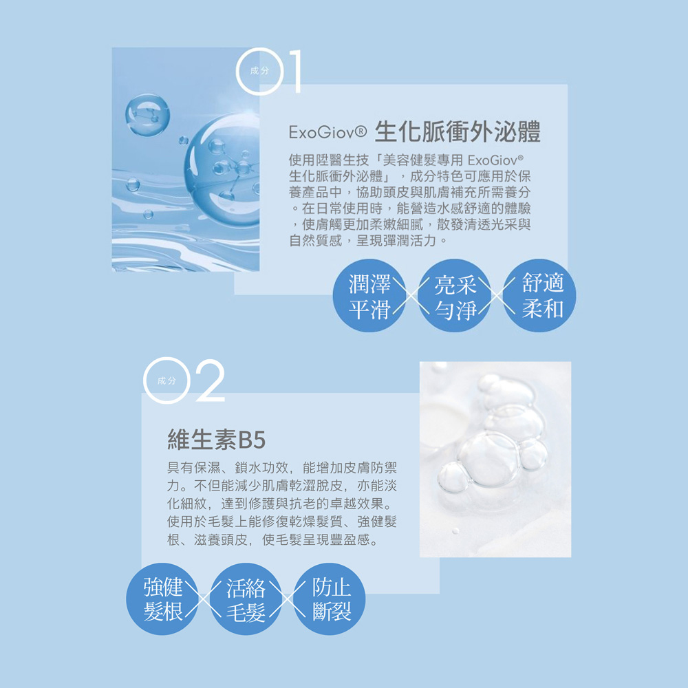 配方內含 B3(菸鹼醯胺)、B5(泛醇)、海藻糖、保濕胜肽、玻尿酸等成分,用以保濕、強化、修護毛根環境