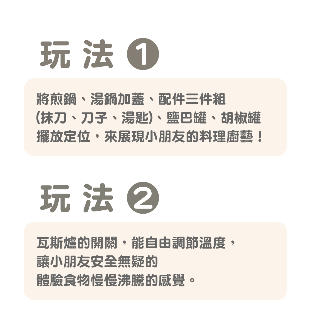 尺寸:30x27.5x24cm重量:1200g材質:山毛櫸木、合板、中密度纖維板(MDF)產地:中國●有了迷你廚房,孩子隨時隨地展示烹飪技巧。一切準備就緒!●多種廚房工具:煎鍋、湯鍋加蓋、配件三件組(抹刀、刀子、湯匙)、鹽巴罐、胡椒罐●瓦斯爐的開關,能自由調節溫度,讓食物慢慢沸騰●迷你廚房不佔空間,收納方便好攜帶●採用FSC™認證木質製成,外觀顏色,使用兒童友善的水性顏料●學習主題:眼部協調/手部小肌肉/形狀/角色扮演/顏色