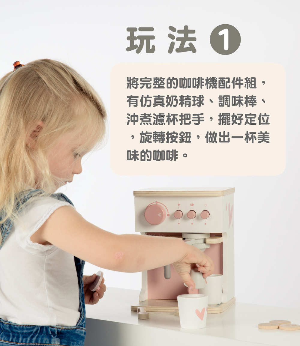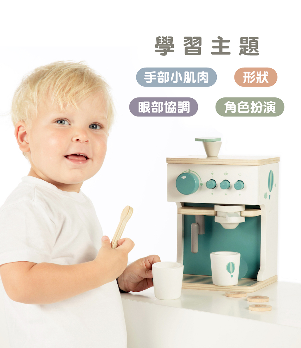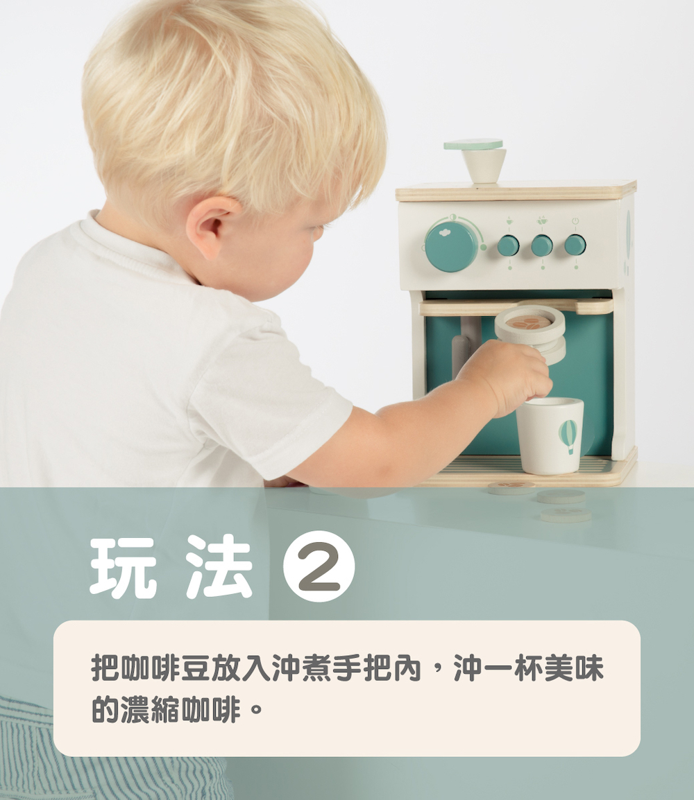 尺寸:16.5x14.5x21cm重量:840g材質:山毛櫸木、合板、中密度纖維板(MDF)產地:中國●坐下來好好享受,用濃縮咖啡機製作的美味咖啡●濃縮咖啡機配有 2 個杯子、2個湯匙、一個鮮奶杯和 3 款咖啡豆●將咖啡機轉動開關後,再選擇沖調的杯數●把咖啡豆放入沖煮手把內,沖一杯美味的濃縮咖啡●沖煮好的咖啡,再用蒸氣管打出綿密的奶泡●採用FSC™認證木質製成,外觀顏色,使用兒童友善的水性顏料●學習主題:眼部協調/手部小肌肉/形狀/角色扮演