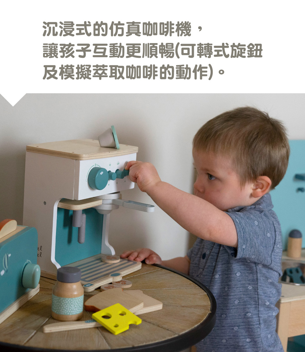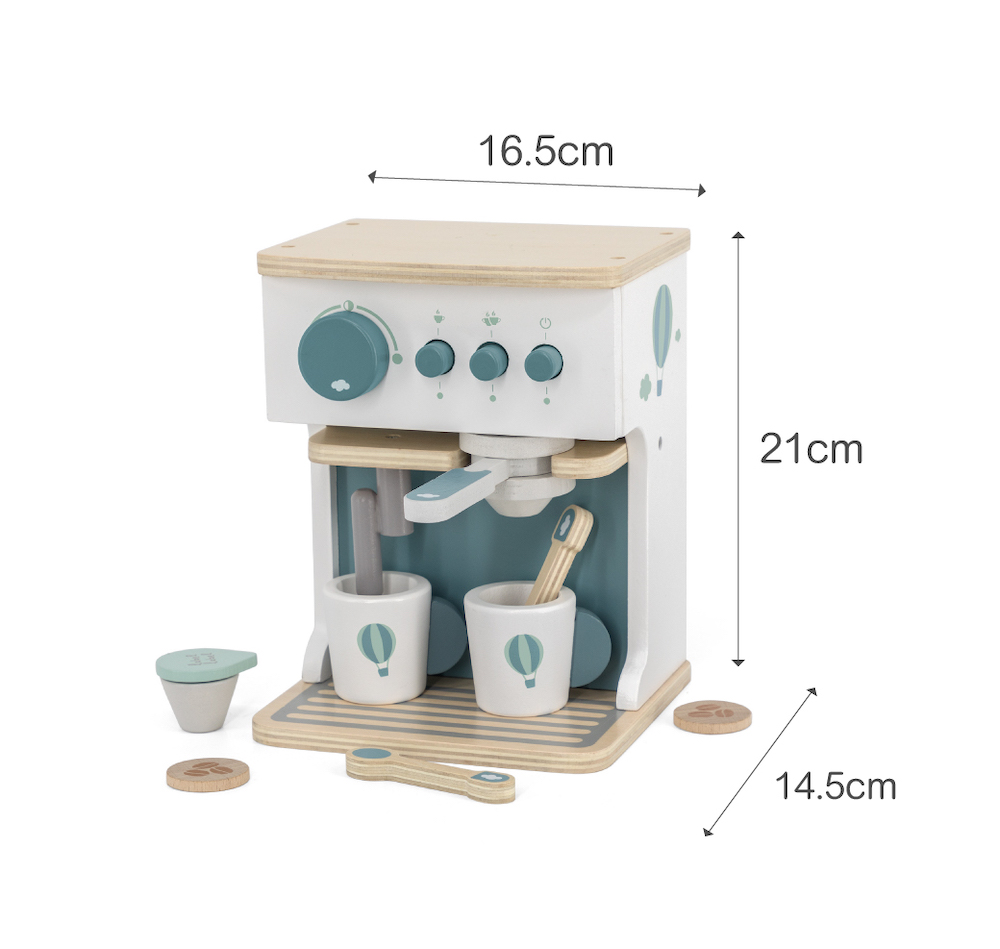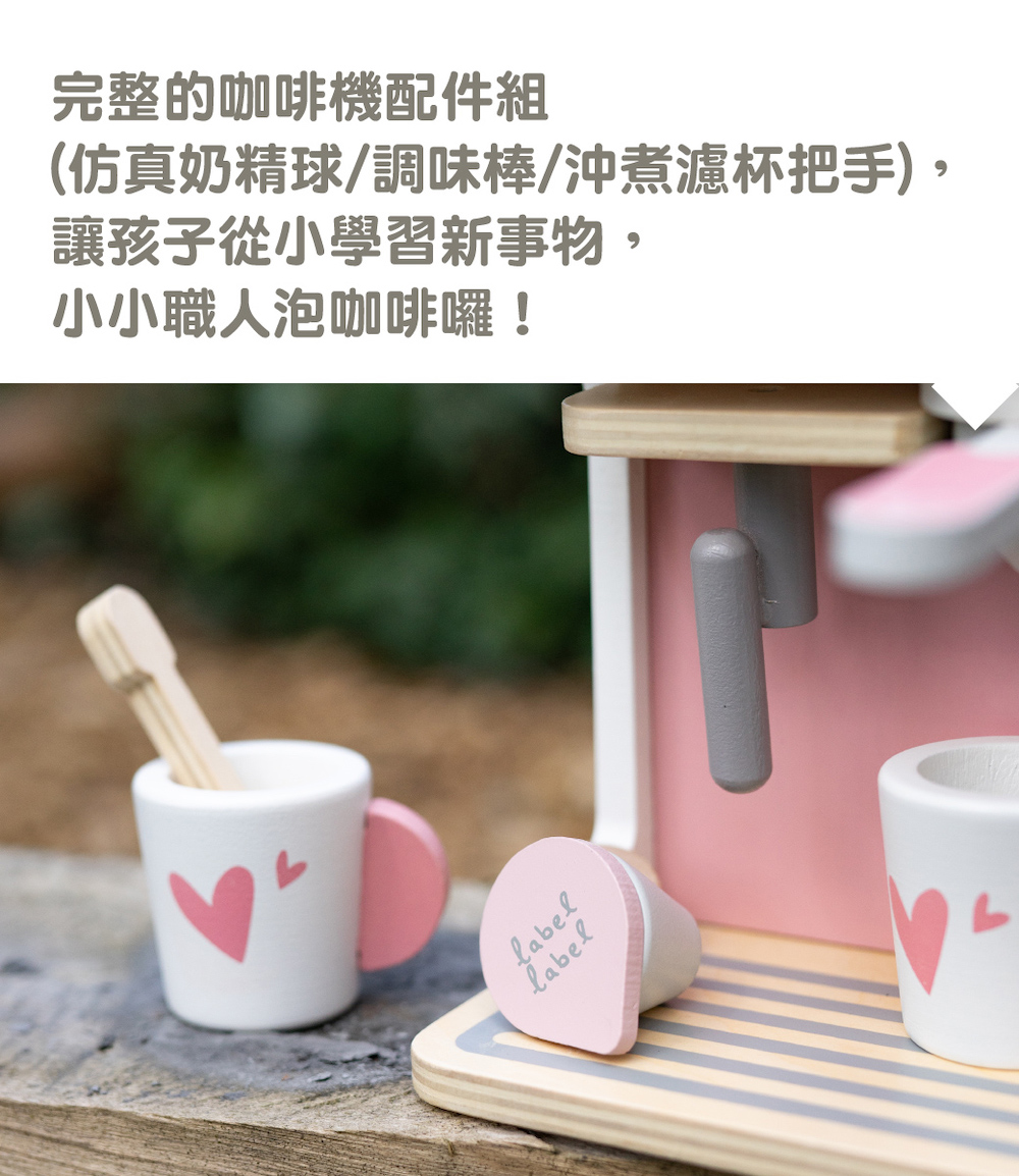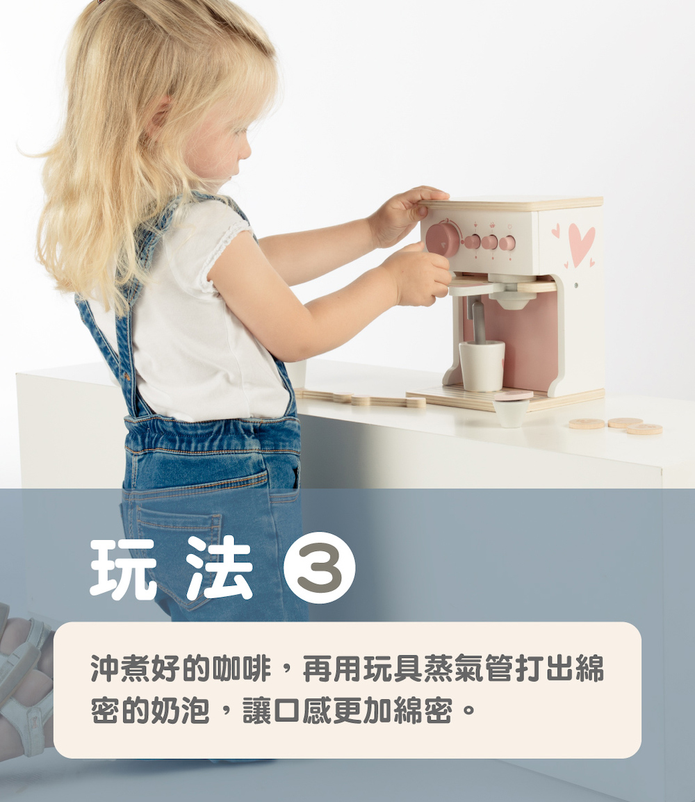 尺寸:16.5x14.5x21cm重量:840g材質:山毛櫸木、合板、中密度纖維板(MDF)產地:中國●坐下來好好享受,用濃縮咖啡機製作的美味咖啡●濃縮咖啡機配有 2 個杯子、2個湯匙、一個鮮奶杯和 3 款咖啡豆●將咖啡機轉動開關後,再選擇沖調的杯數●把咖啡豆放入沖煮手把內,沖一杯美味的濃縮咖啡●沖煮好的咖啡,再用蒸氣管打出綿密的奶泡●採用FSC™認證木質製成,外觀顏色,使用兒童友善的水性顏料●學習主題:眼部協調/手部小肌肉/形狀/角色扮演