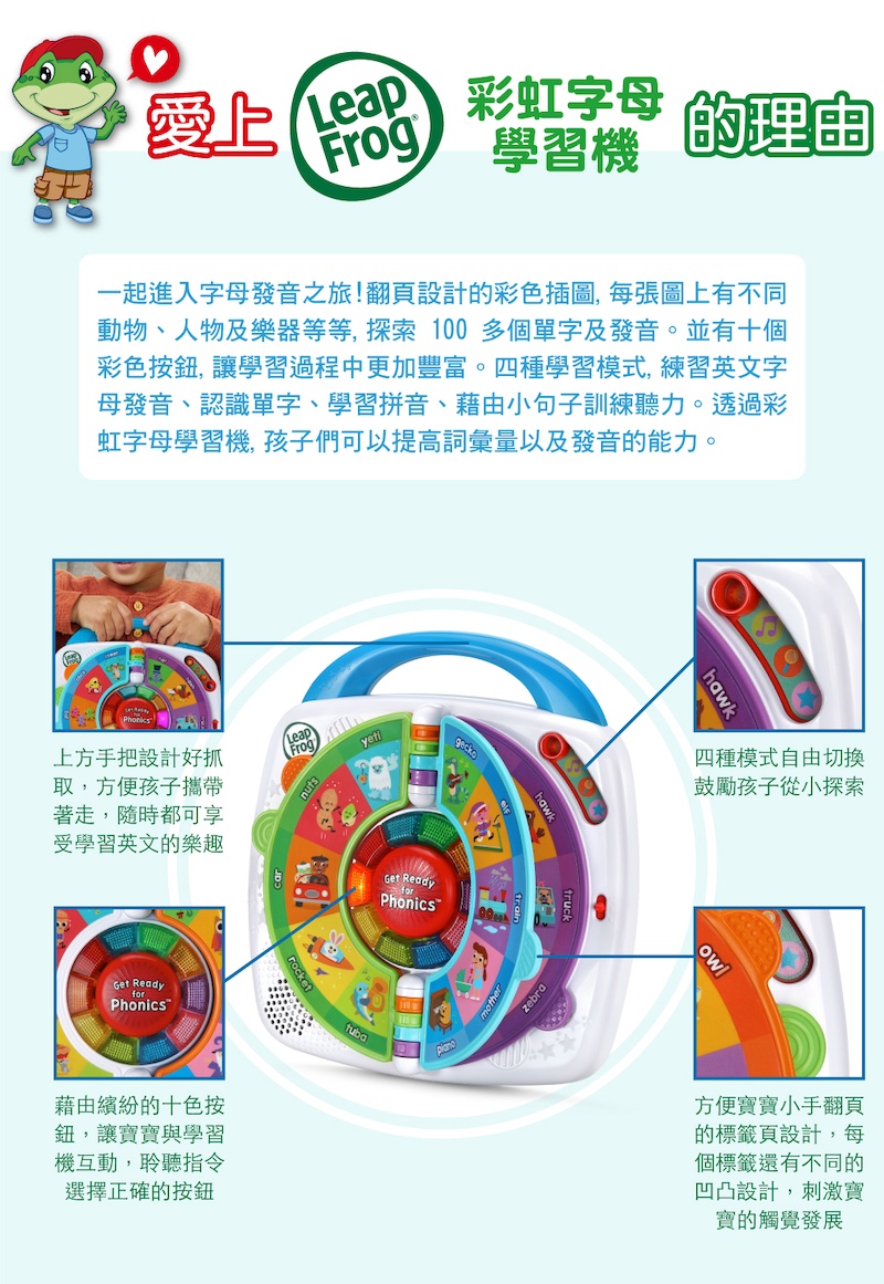●十頁翻頁設計,每張插圖上有不同動物、人物及樂器,探索100多個單字及發音●十個彩色按鈕,讓學習過程中更加豐富●三種模式,學習字母發音、單字及短句子。依照學習機發出字母的發音,點選正確的單字●音樂模式,會發出生動的聲音,讓認識單字過程更有趣●點選中間紅色按鍵,會隨機跳出三到四個字母,拼成一個單字。可練習聽力及拼音●多元學習主題-發音/單字/拼音