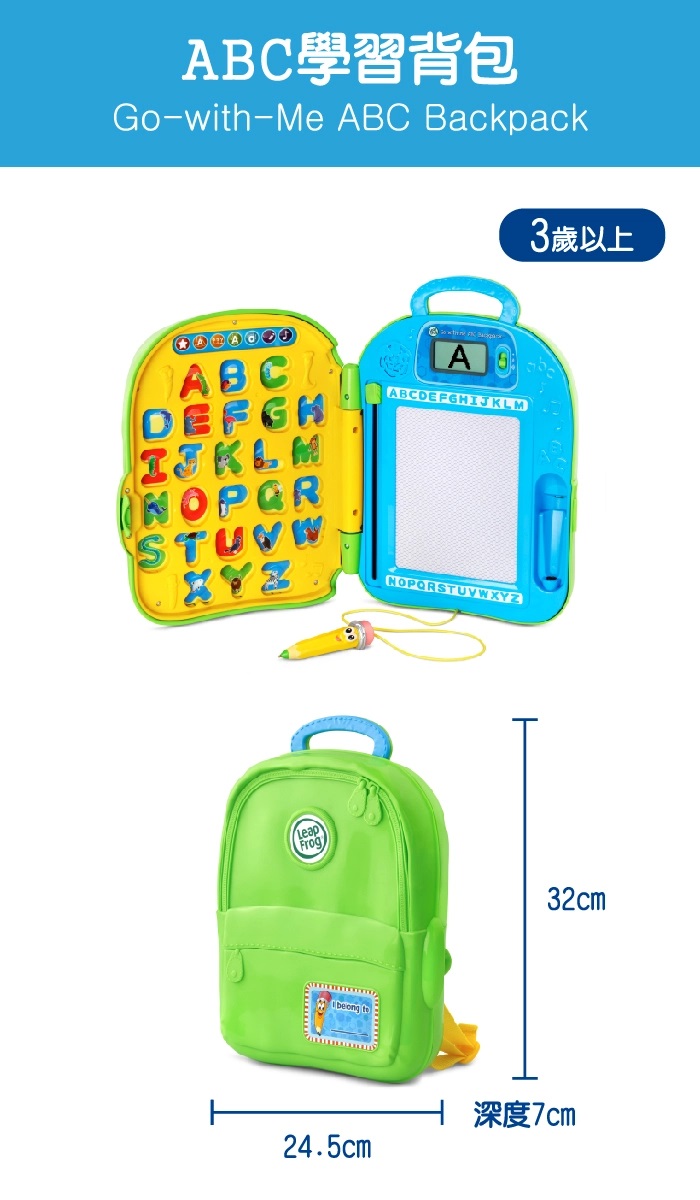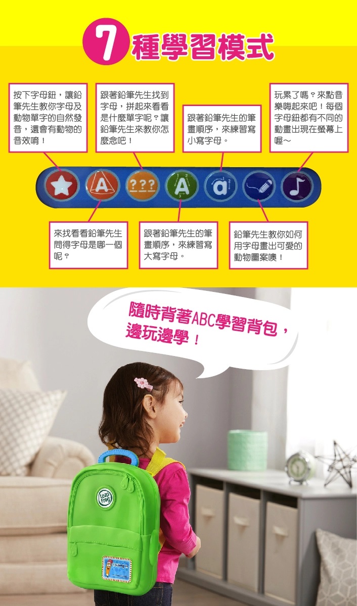 *可愛鉛筆先生造形握筆*背包造型輕鬆帶著走*拼字功能學習發音更有趣*字母拼圖,訓練小肌肉,認識字母好好玩*內建大小寫字母、筆順、畫畫等運筆練習*增進孩童對字母的認識及寫字握筆行動技能*學習主題-字母、拼字、拼音、藝術與繪畫、動物、寫作