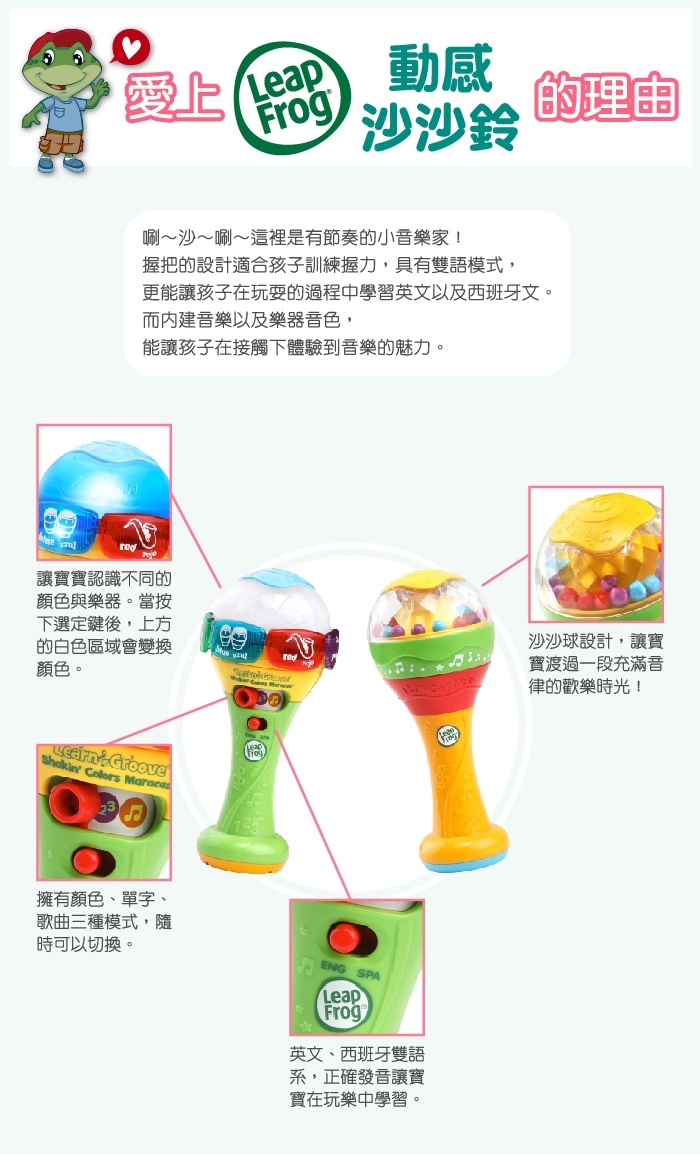 並有三種音遊戲模式,包含介紹顏色、數字和音樂,同時具備雙語模式(英語及西班牙文)可供切換。六個彩色按鈕分別代表不同樂器,孩子能在搖擺震動的過程當中,感受到音樂的樂趣。