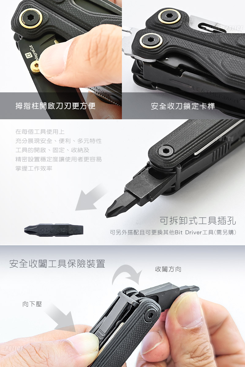 特色:》拇指柱,易於主刀快速開啟》全工具皆可鎖定(鉗頭除外)》外部鎖定功能》Bit套件相容性(需另購)》可拆式背夾(需另購)》美國製造※ 【 原廠出貨時已無附任何相關配件,如收納套與 Bit 套件組、需另購 】 ※