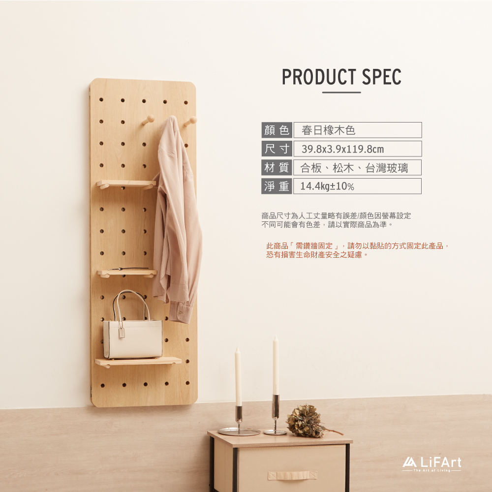 • MIT台灣設計工藝,使用台灣玻璃• 多功能配件組合、自由搭配• 嚴選E1板材符合歐盟(EN)低甲醛釋放量標準• 需釘牆固定/材質:合板(主體)、松木(配件)、台灣玻璃顏色:春日橡木色整體尺寸:40-74.8Wx4Dx120Hcm ±1mm重量:14.4kg±10%鏡子尺寸:39x103cm洞洞板厚度:1.4cm底板厚度:1.6cm★此商品「需鑽牆固定」,請勿以黏貼的方式固定此產品,恐有損害生命財產安全之疑慮。/※情境圖文不含擺飾物。※商品尺寸為人工丈量略有誤差;顏色因螢幕設定不同可能會有色差,請以實際商品為準。※如遇商品瑕疵或價格錯誤,本公司保有是否接受或取消訂單的權利。※離島及偏遠地區酌收貨運公司加收的額外派送費用。※收到商品時,請先確認商品運送中有否損壞或零件短少等,如有問題請勿組裝並盡快與我們聯繫。
