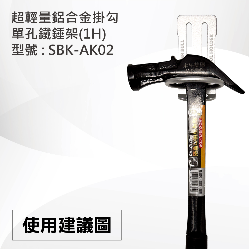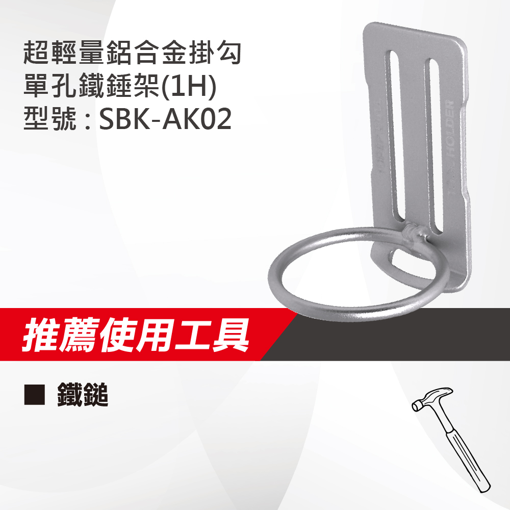名稱 : 超輕量鋁合金掛勾-單孔鐵錘架(1H)型號 : SBK-AK02重量 : 32g推薦使用工具 : 鐵鎚