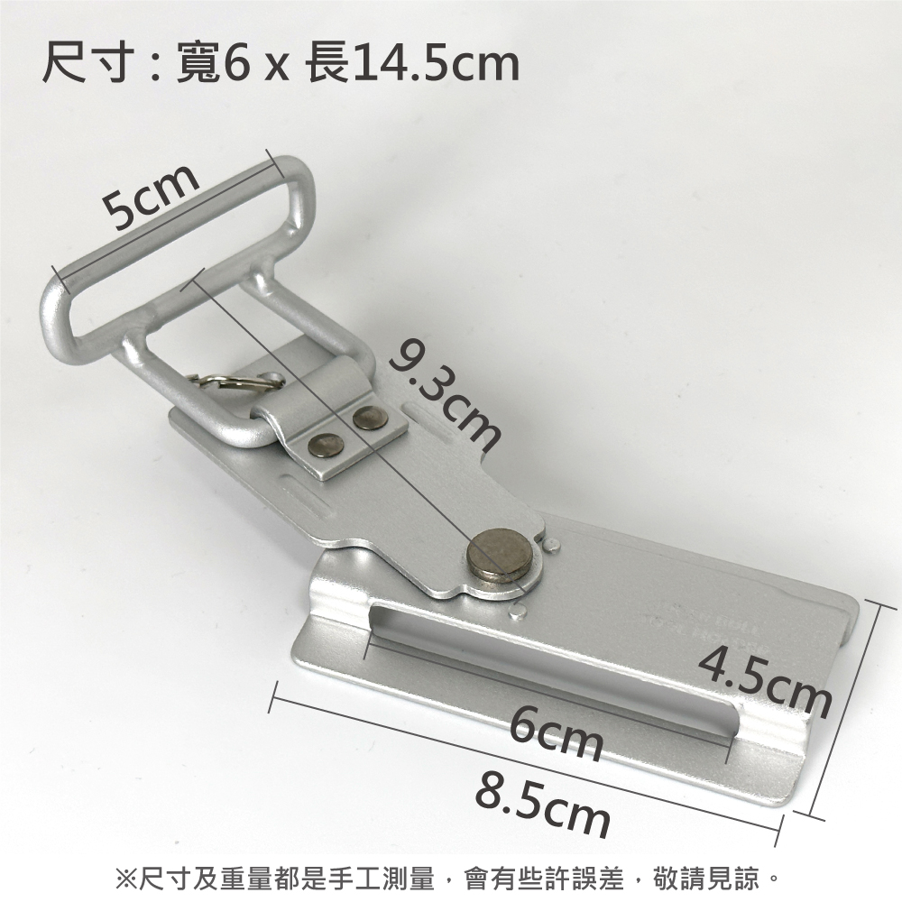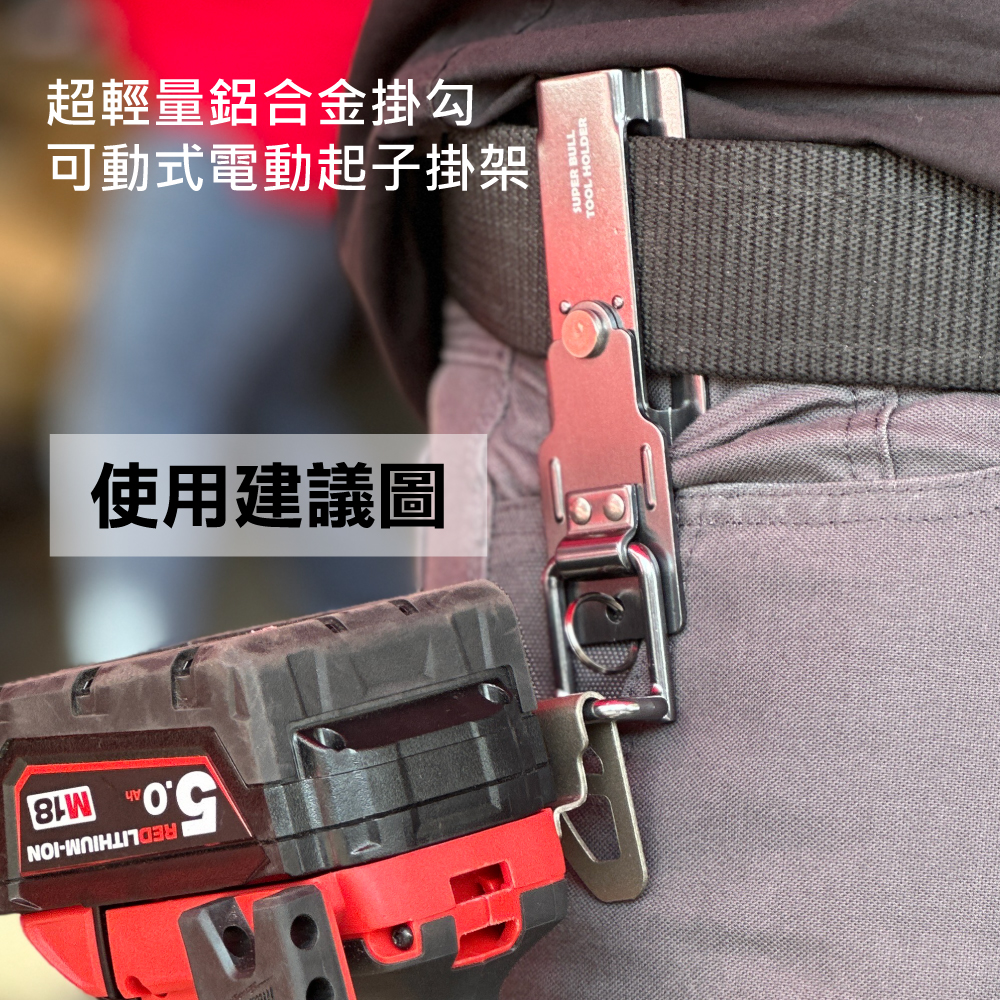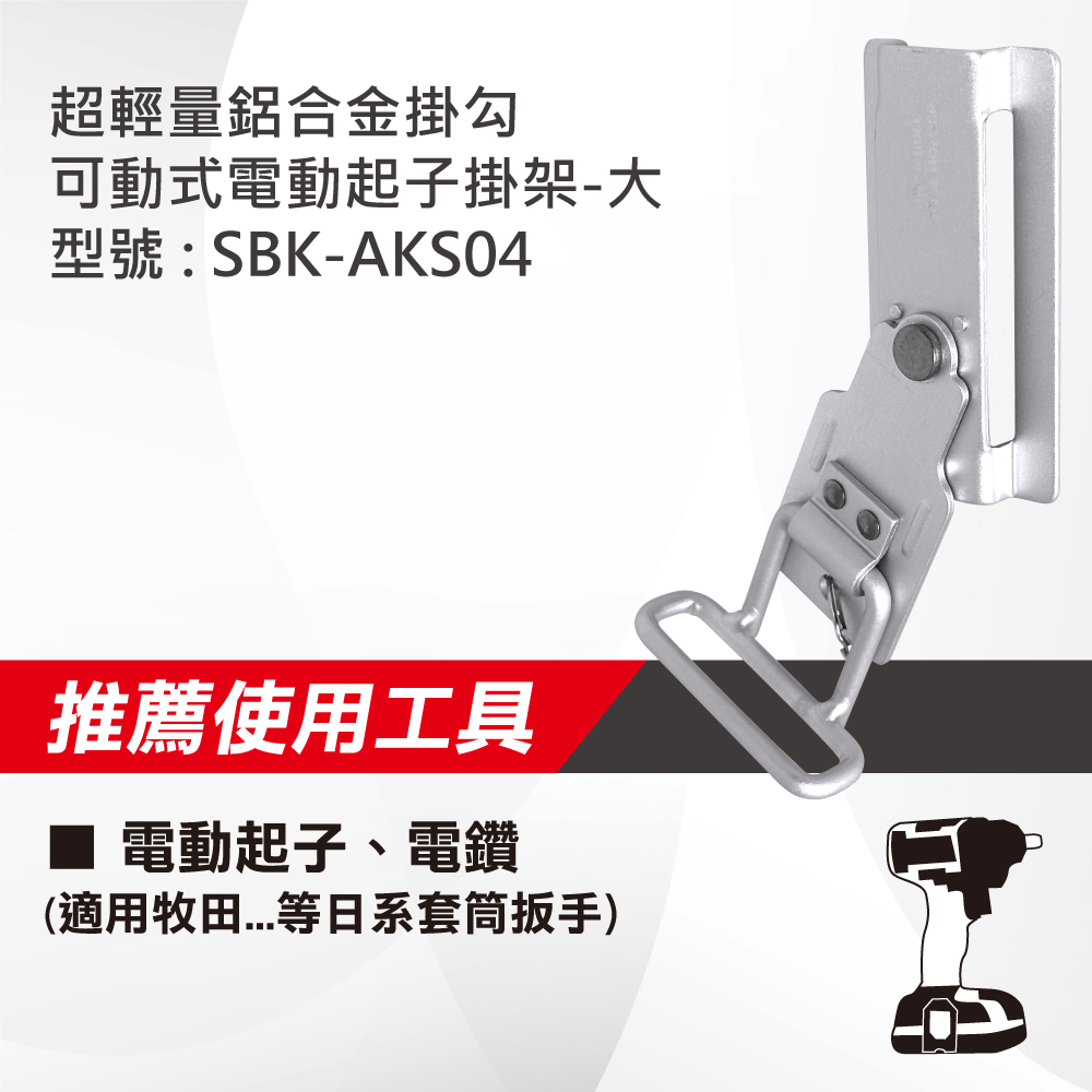 名稱 : 超輕量鋁合金掛勾-可動式電動起子掛架-大型號 : SBK-AKS04重量 : 52g推薦使用工具 : 電動起子、電鑽 (適用牧田...等日系套筒扳手)