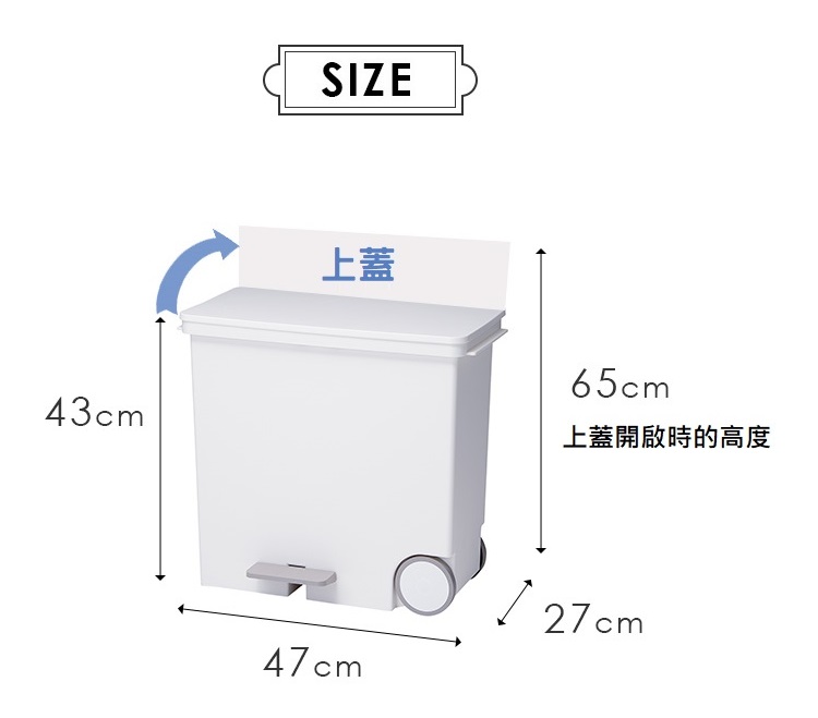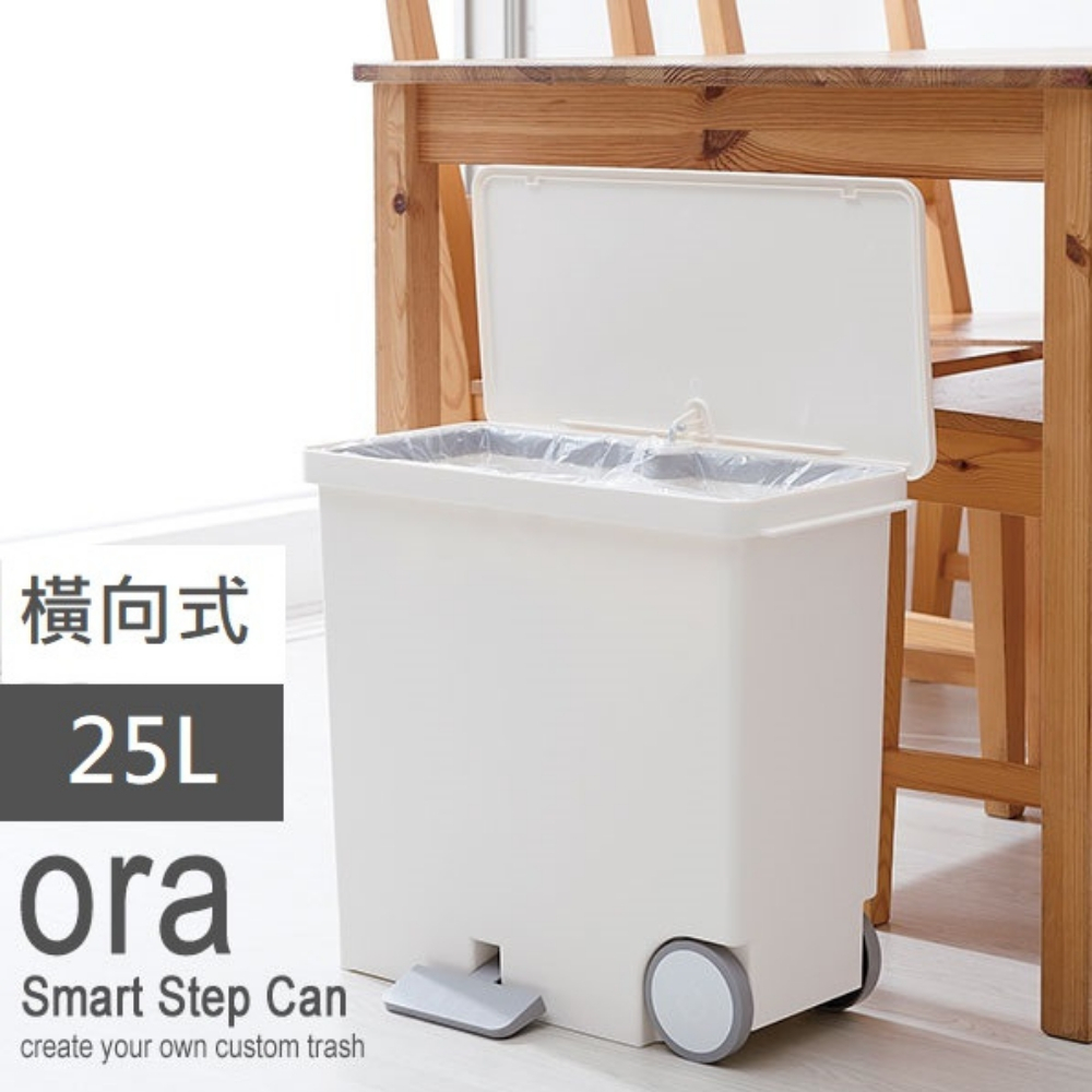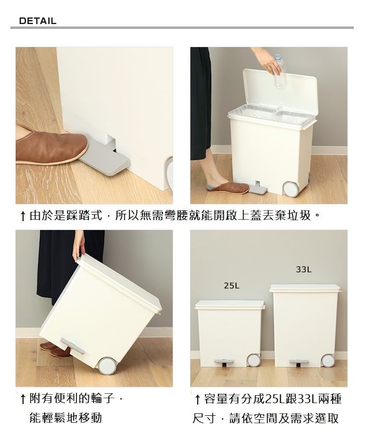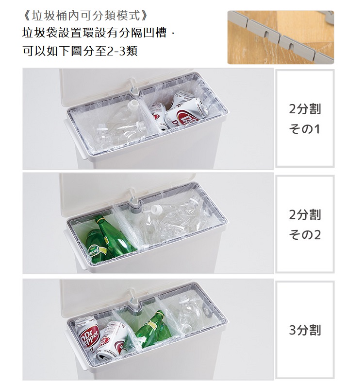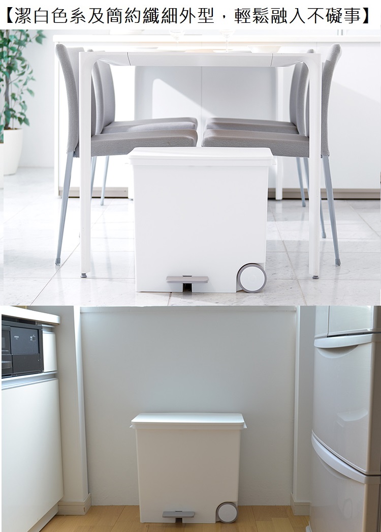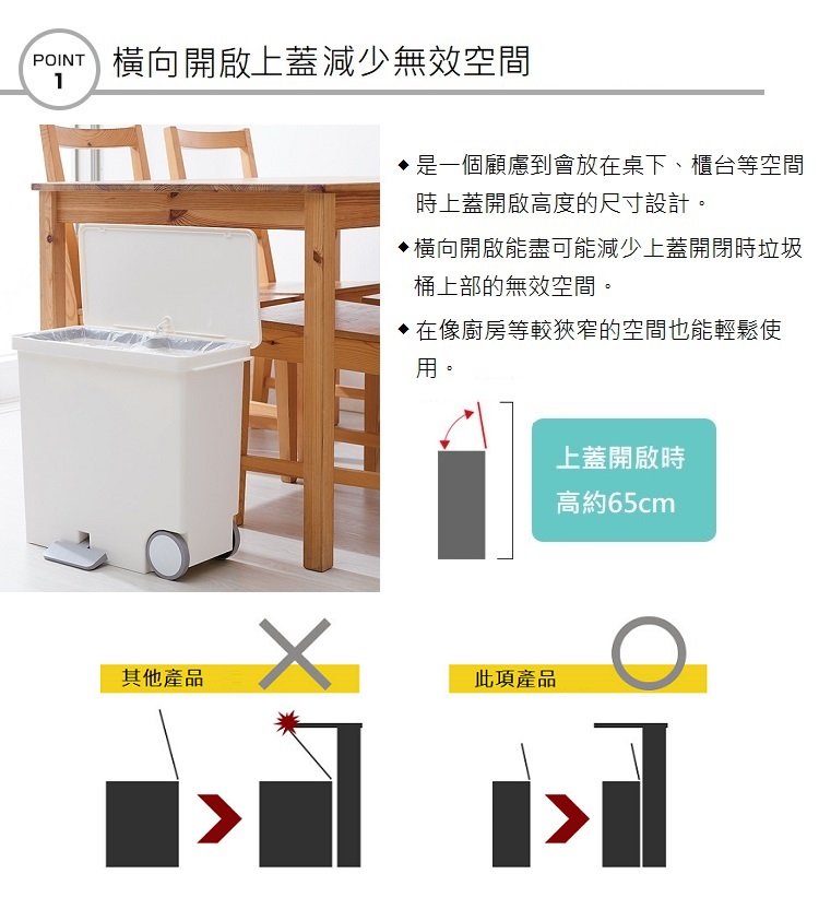 輕薄、橫向式設計 放置於家裡任何角落都可以內附垃圾袋設置環設置環凹槽分隔設計,可用1或多個垃圾袋輕鬆分類踩踏方式,丟棄垃圾超方便腳輪設計,讓您可以輕鬆的移動它