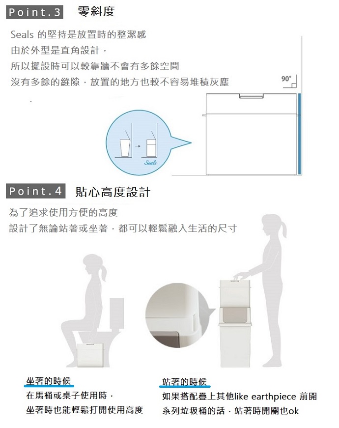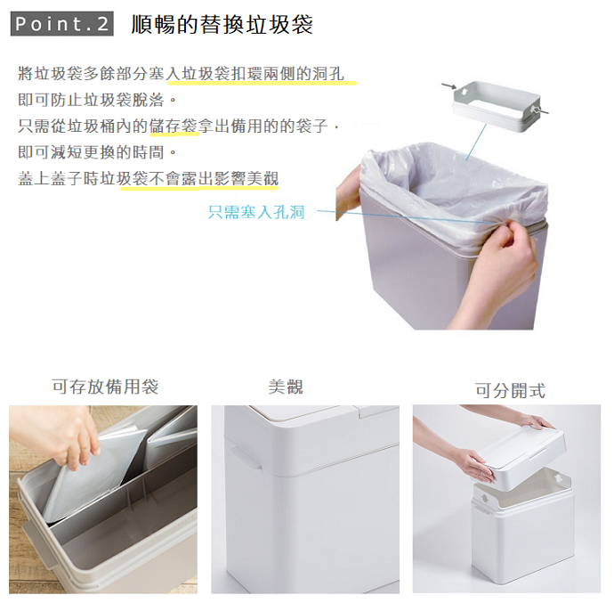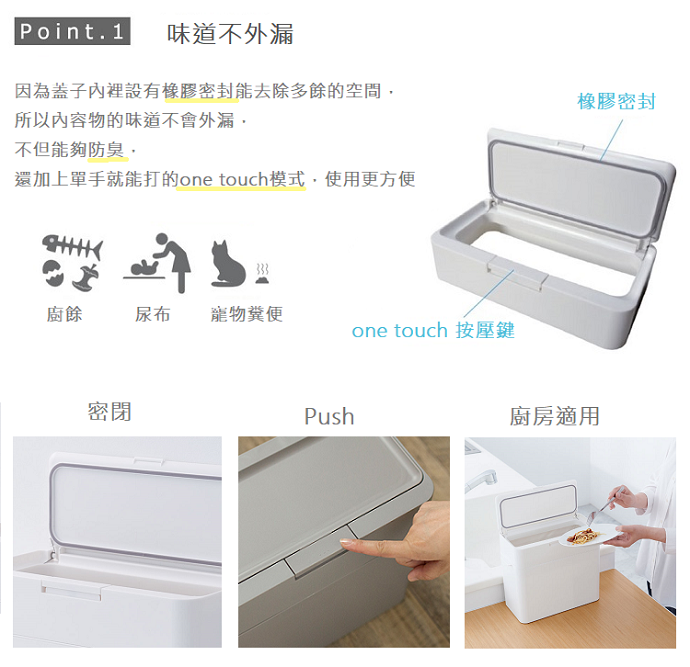 單手就能打開的one touch模式設有橡膠邊條的密封設計,垃圾味道不外流非常適合當廚餘桶使用內部還設有貼心的儲存曹,可存放備用的垃圾袋再加上外型時尚俐落,90度直角設計讓你可以更貼近牆面也可搭配其他like it前開系列商品堆疊使用