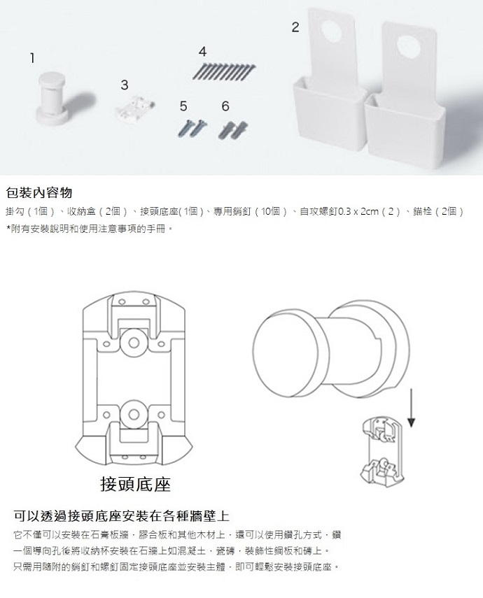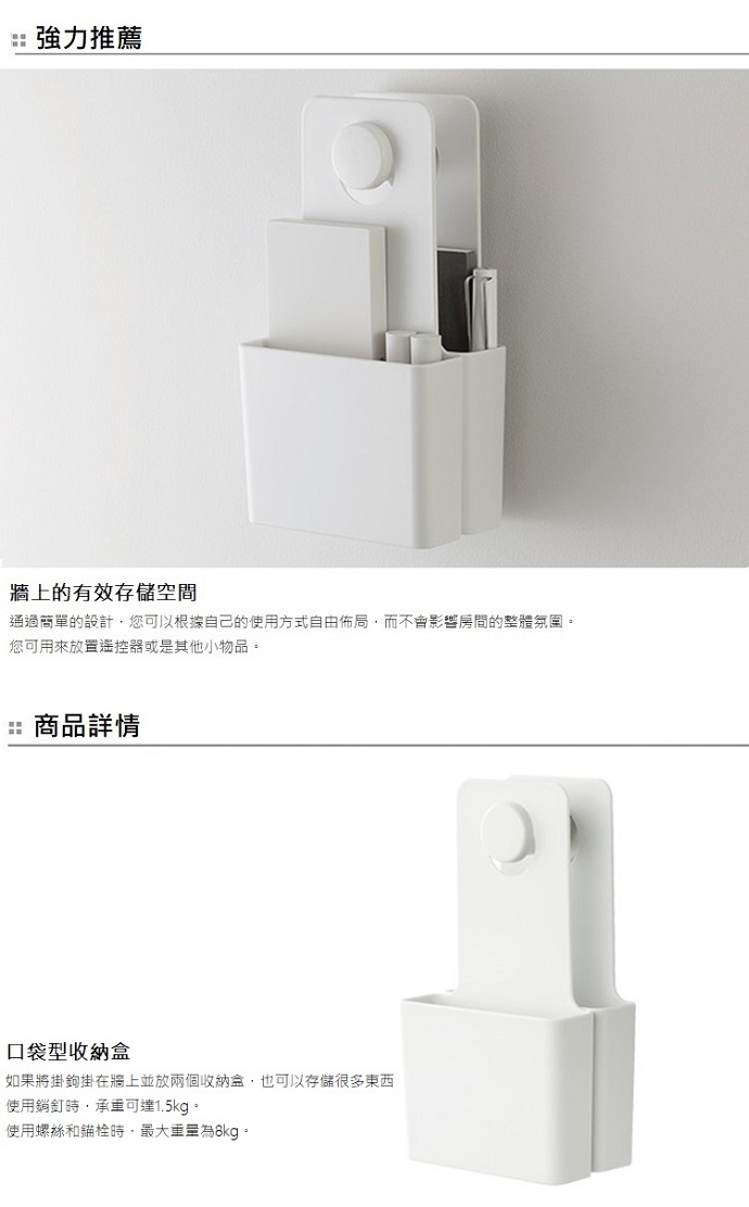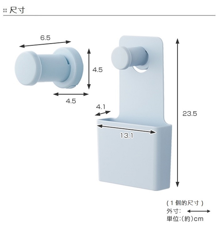 商品規格*此賣場是”二入組”的商品尺寸:掛勾:約寬4.5 x深6.5x高4.5(cm)/收納盒:約寬13.1 x深4.1x高23.5(cm)/個重量:全部約314g材質:掛勾、收納盒/接頭底座:泡沫聚苯乙烯樹脂、螺釘/銷釘:鋼(單色鍍)、錨栓:尼龍內容物:掛勾,收納盒(2個)、接頭底座,專用銷釘(10個),自攻螺釘0.3×2cm(2個),錨栓(2個)*附有安裝方法和使用注意事項的手冊。耐荷重:使用銷釘時:最大可耐重1.5kg/使用螺絲釘和錨栓時:最大可耐重8kg製造地:日本
