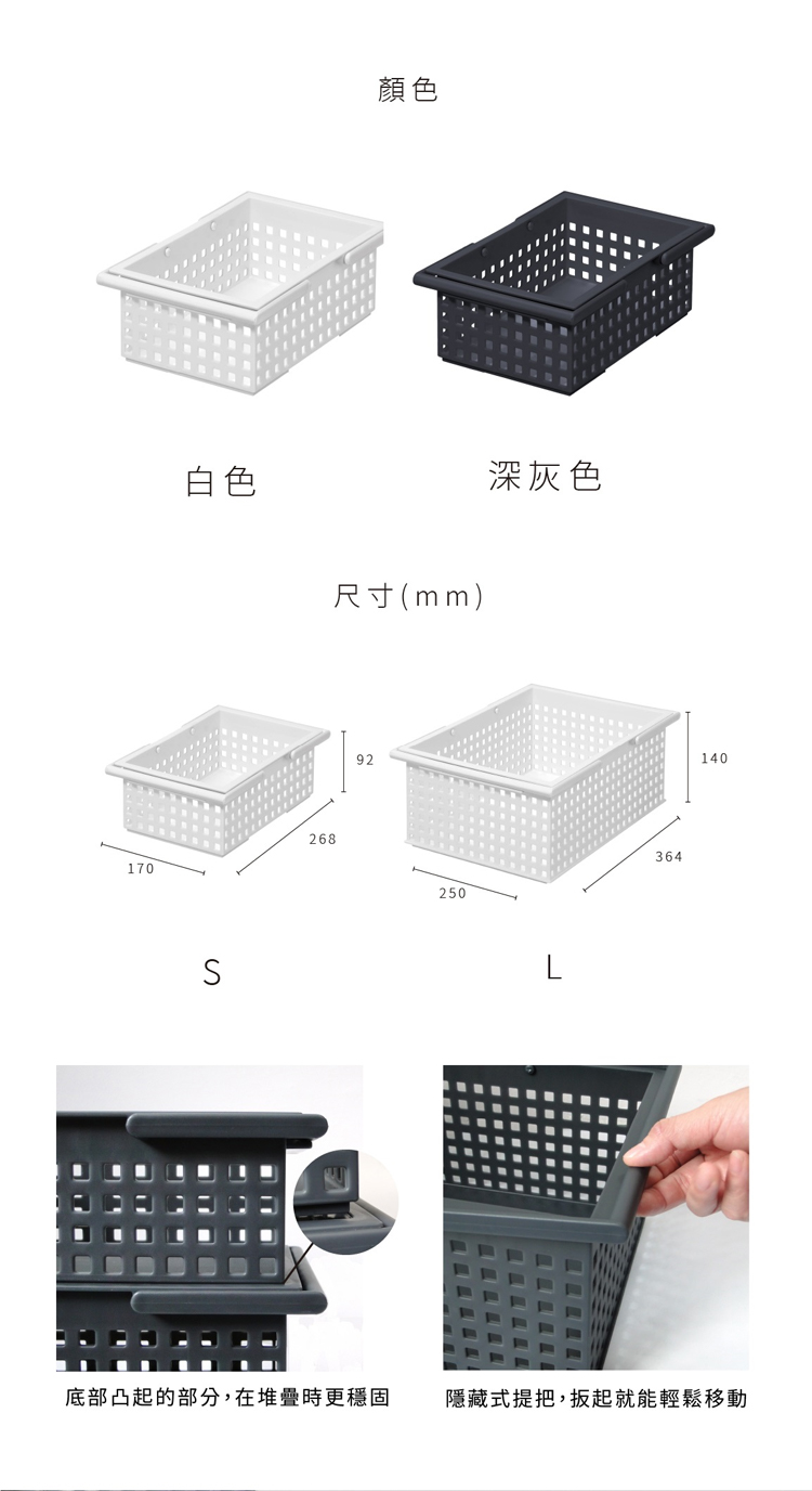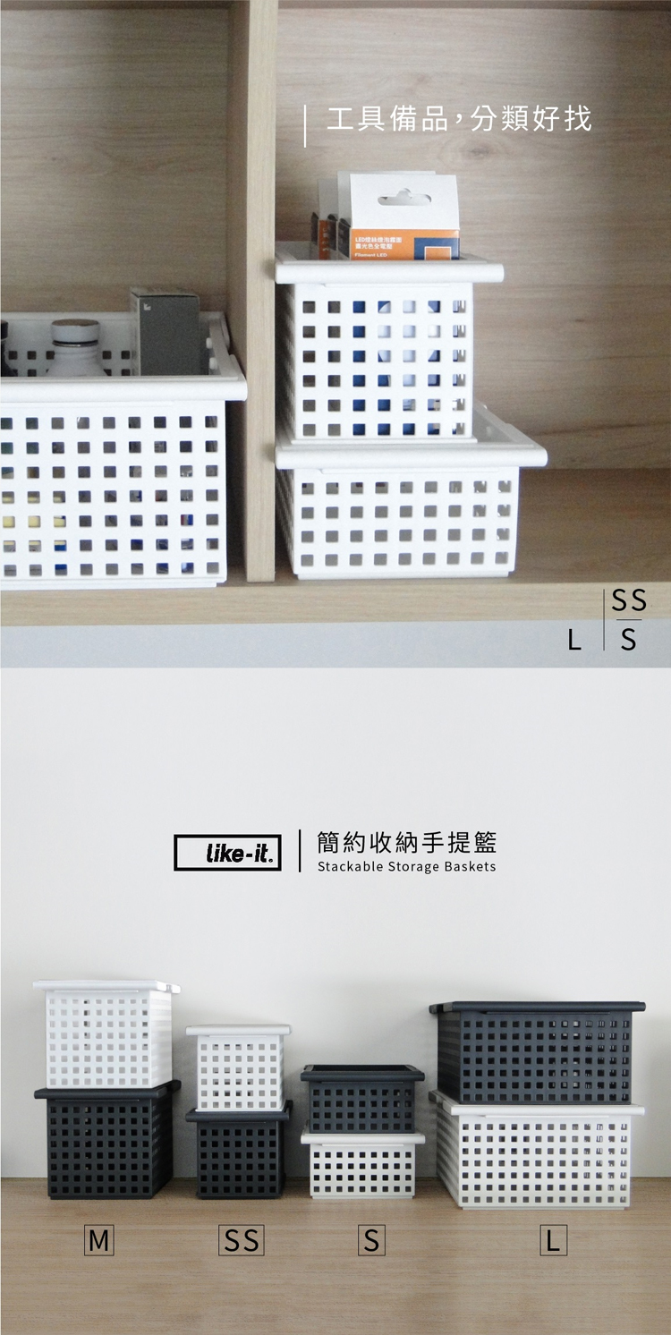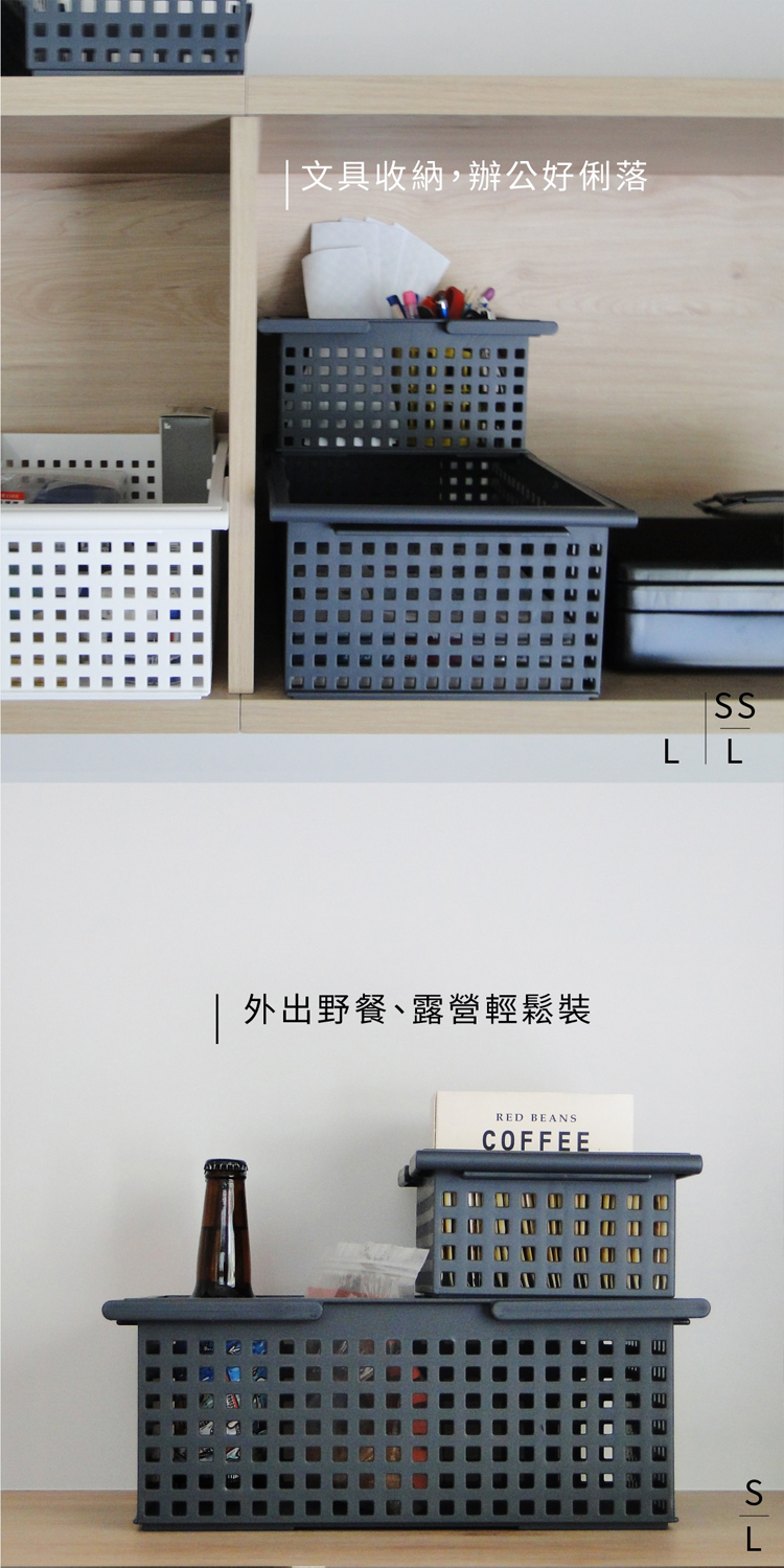 【 此賣場為 2個S+1個L 三入組 】好收納 可手提 輕巧 可堆疊您絕對不能錯過的日系簡約美型 提籃式桌面收納籃SS、S、M、L 四種此尺寸 隨意搭配使用同樣高度排一起還可當分類格使用放在衣櫃內也可以收納 襪子、內衣、內褲 等小物擁有手提把,提著就可以任意移動,因此在野外露營、野餐也都非常便利商品規格L 尺寸:(約)寬度364 x深度250 x高度140mm (提起手柄:255mm)L 重量:530±3gS 尺寸:(約)寬度268 x深度170 x高度92mm (提起手柄:183mm)S 重量:265±3g顏色:深灰色、白色材質:聚丙烯製造地:日本