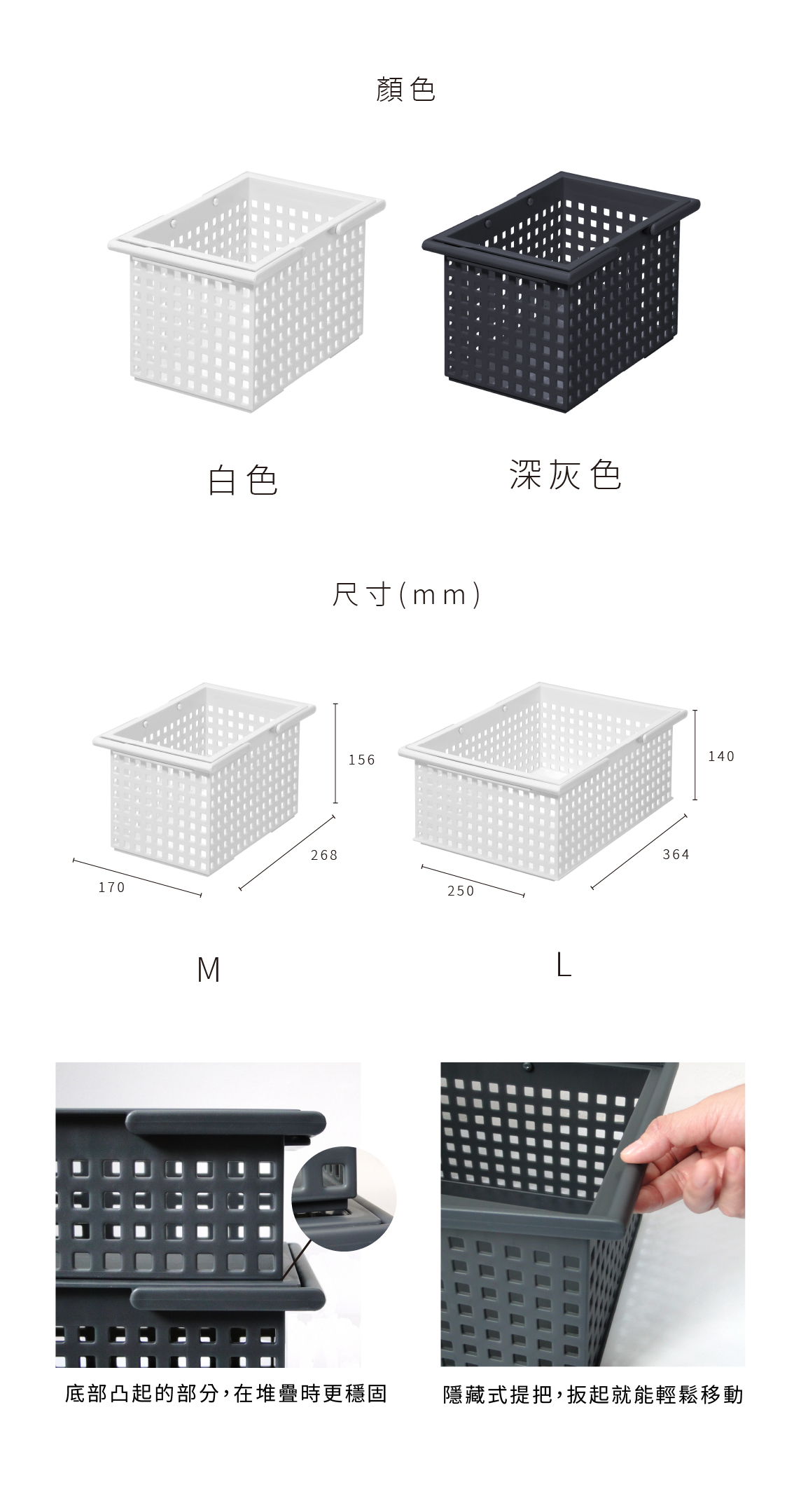 商品規格L 尺寸:(約)寬度364 x深度250 x高度140mm (提起手柄:255mm)L 重量:530±3gM 尺寸:(約)寬度268 x深度170 x高度156mm (提起手柄:245mm)M 重量:345±3g顏色:深灰色、白色材質:聚丙烯製造地:日本