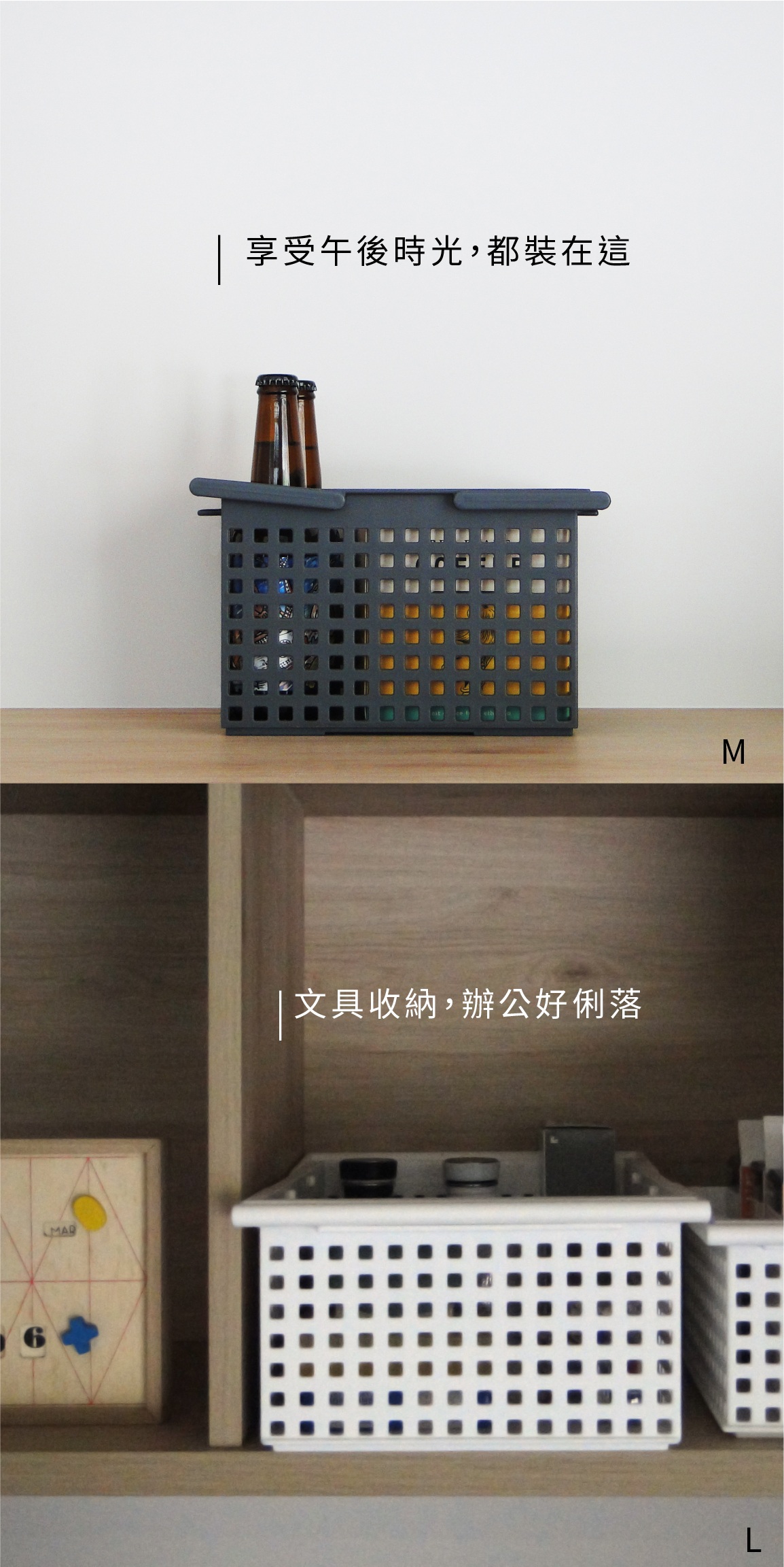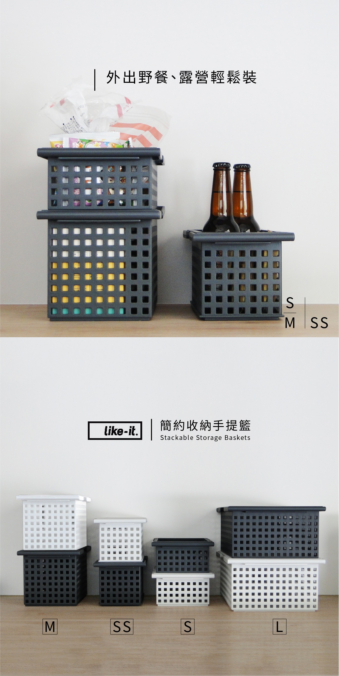 【 此賣場為 2個M+1個L 三入組 】好收納 可手提 輕巧 可堆疊您絕對不能錯過的日系簡約美型 提籃式桌面收納籃SS、S、M、L 四種此尺寸 隨意搭配使用同樣高度排一起還可當分類格使用放在衣櫃內也可以收納 襪子、內衣、內褲 等小物擁有手提把,提著就可以任意移動,因此在野外露營、野餐也都非常便利