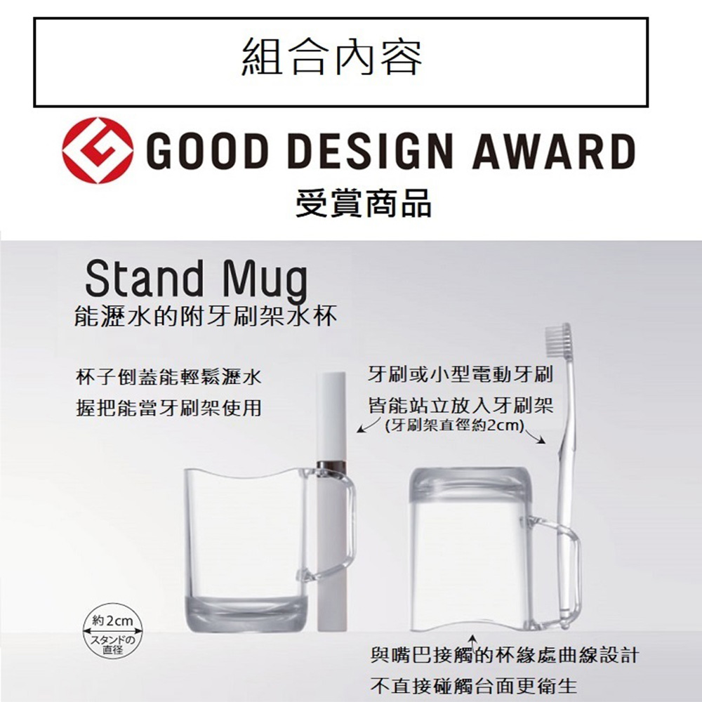 漱口杯杯緣彎曲曲線設計,向下倒蓋能快速將水瀝乾接觸口的地方不直接觸碰檯面又衛生握把處設計成可放置牙刷或小型電動牙刷的架子,使用更方便珪藻土杯墊能瞬間吸附水杯上的水滴,保持乾爽再加上底部腳墊設計,於檯面間有空間能保持通風※此款內容物包含:瀝水漱口杯(透明白款)*1+吸水珪藻土杯墊*1