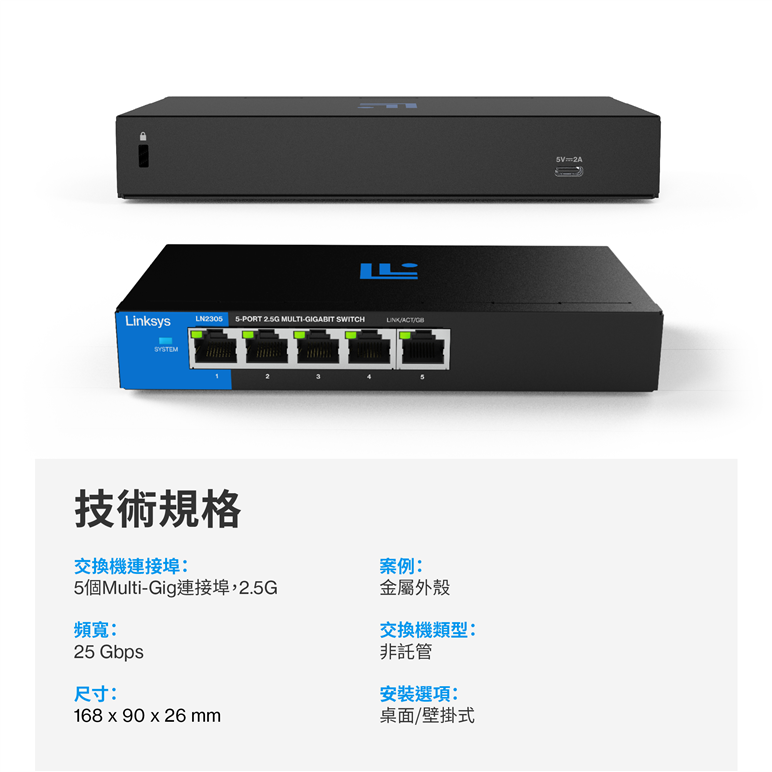 昌運監視器 Linksys LN2305-AH 5-Port 2.5G Multi-Gigabit 非網管型交換器
