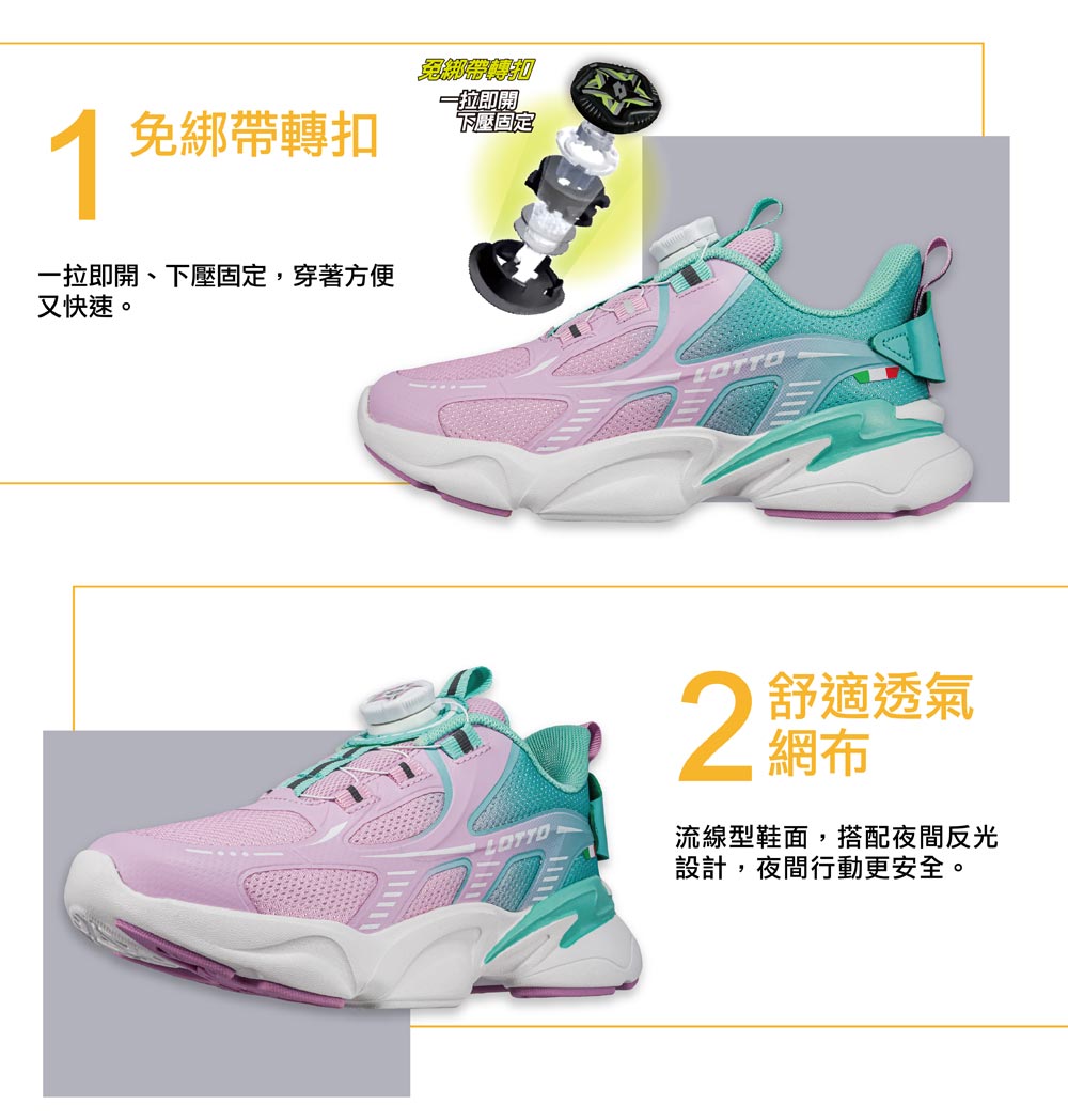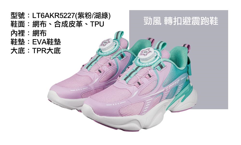 LOTTO童勁風轉扣避震跑鞋-粉紫湖綠22.5