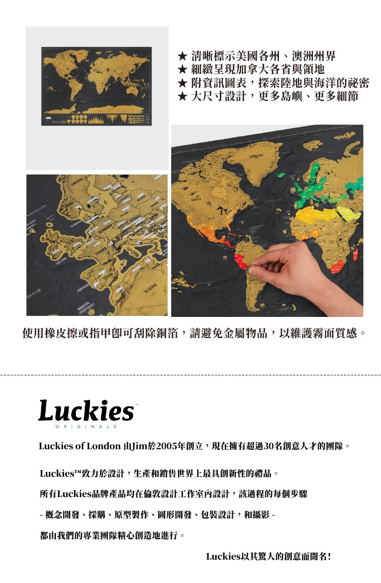 送禮的頂級選擇源自 2009 年英國 Luckies of London 原創專利,數百萬次的銷售見證它的經典。每一幅皆附高質感收納筒包裝,成為送給環遊世界夢想家的完美禮物。