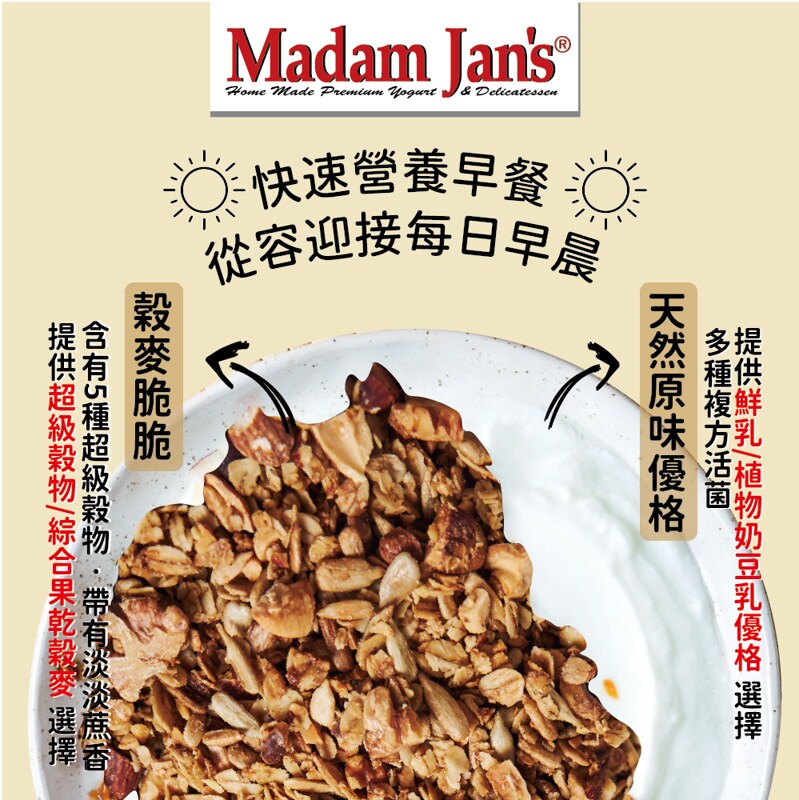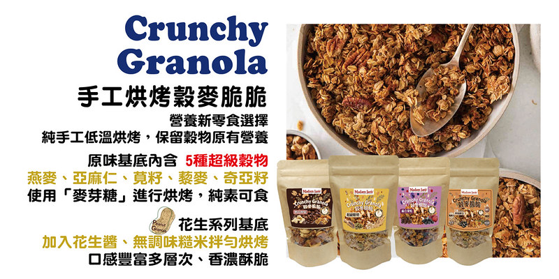純手工低溫烘烤,保留穀物原有營養,使用「麥芽糖」進行烘烤,純素可食,帶有甘蔗清香。內含五種超級穀物(燕麥、奇亞籽、亞麻仁、藜麥、莧籽),富含多種維生素及膳食纖維
