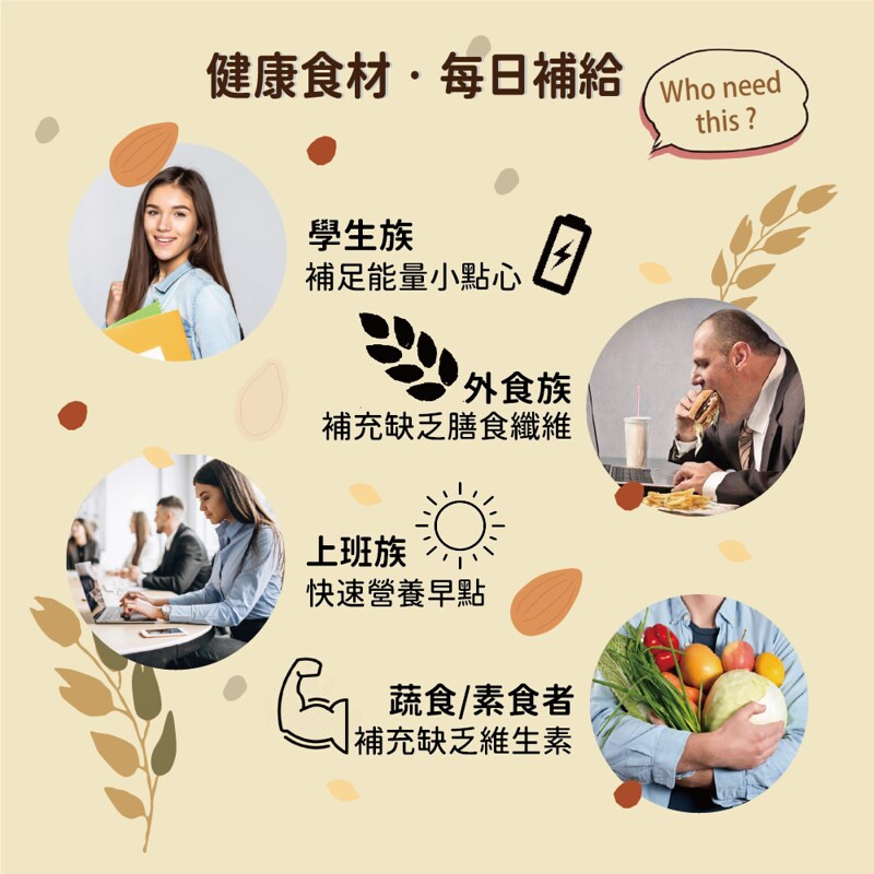 純手工低溫烘烤,保留穀物原有營養,使用「麥芽糖」進行烘烤,純素可食,帶有甘蔗清香。內含五種超級穀物(燕麥、奇亞籽、亞麻仁、藜麥、莧籽),富含多種維生素及膳食纖維