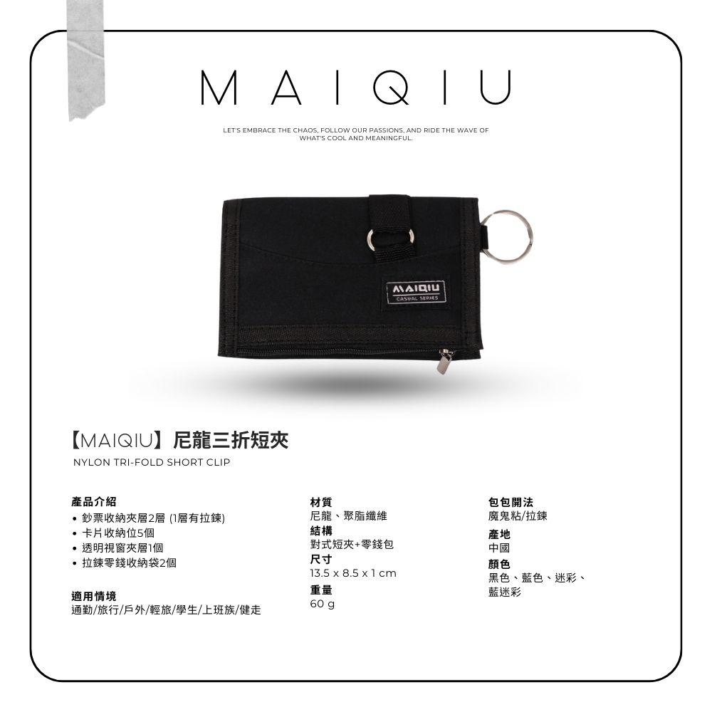 【產品介紹】MQ 尼龍三折短夾① 鈔票收納夾層2層 (1層有拉鍊)可完整平放千元大鈔② 卡片收納位5個③ 透明視窗夾層1個④ 拉鍊零錢收納袋2個材質:尼龍、聚脂纖維結構:對式短夾+零錢包顏色:黑色、藍色、迷彩、藍色迷彩尺寸:13.5 x 8.5 x 1 (長 x 寬 x 厚)重量:60 g#MAIQIU #短夾 #皮夾 #男性 #中性 #學生#布料 #情人節禮物 #尼龍 #潮流 #輕巧 #耐用 #魔術皮夾 #尼龍夾 #wallet#開學季 #畢業禮物