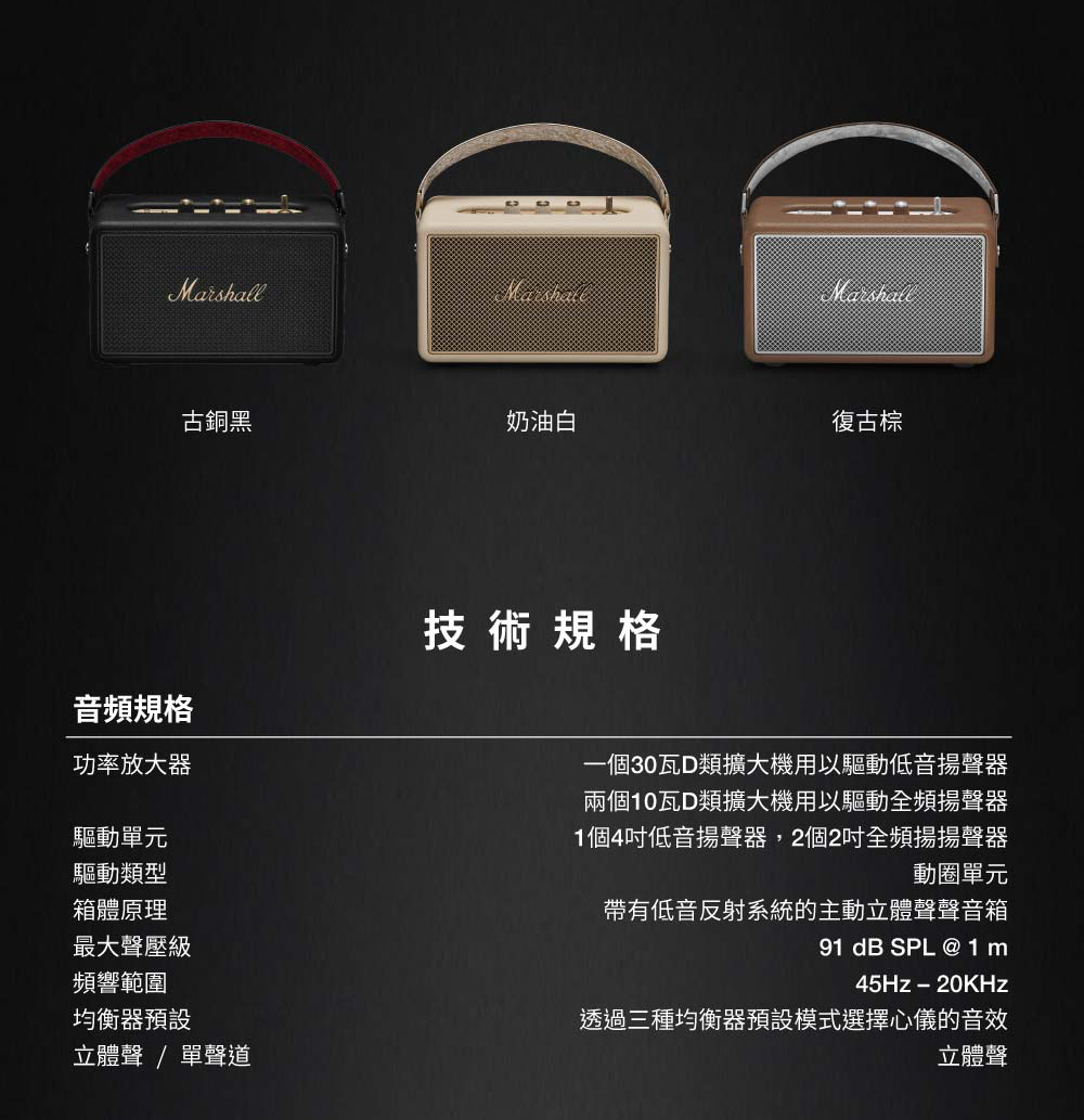商品規格︰■型號:Marshall Kilburn III■保固:一年+到貨7日內線上登錄共享18個月超長保固■產地:泰國■貨源:台灣百滋公司貨■顏色︰古銅黑、奶油白、復古棕■藍芽:5.0 Auracast藍芽技術■藍牙連接範圍︰10公尺■藍牙多點連接︰有■有線連接︰AUX 3.5mm■麥克風︰無■功率放大器︰30W低音揚聲器X1+10W全頻揚聲器X2■續航時間:50小時■尺寸︰273 x 150 x 169 mm■重量︰2.8公斤■防塵防水︰IP54■NCC認證碼:CCAN25LP0350T4■BSMI︰R38900~2028.04.20■配件/內容物:Kilburn III藍牙喇叭、充電線、快速入門指南、法律與安全資訊■!!!!︰請從喇叭的最底部抬起,請勿直接拉起防塵布,以避免產品摔落的危機。注意事項︰1. 此商品為影音相關之進口商品,拆封後無法以新品販售,故不做退換貨。開封後僅接受商品暇疪時之退貨或換發新品。2. 鑑賞期非試用期,若無商品暇疪要退換貨,退貨商品之包裝及內容物均須完整無破損無開封,方可申請退換貨,否則將酌收10%~30%整新費,回收之舊品將以打折之福利品再販售,不會再以新品重新販售,請客人多加注意及體諒!3. 建議客人在未確定品牌、款式型號、顏色、尺寸前,請先至實體店看實機並試聽,避免買賣雙方困擾。4. 產品顏色會因網頁呈現而有些許差異,以收到實品為準 。