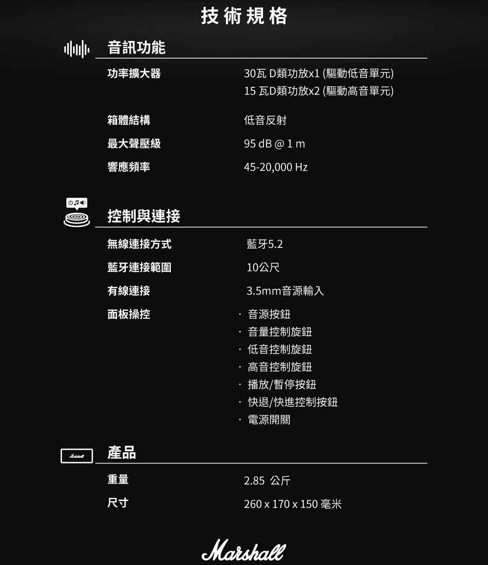 商品規格︰■保固:一年+到貨7日內線上登錄延長半年保固■顏色︰經典黑/奶油白/復古棕■音源播放模式 :5.2 無線藍牙傳輸、3.5mm音源輸入■藍牙連接範圍︰10公尺■低音單體:30瓦 D類擴大器x1(驅動低音單元)■高音單體:15瓦 D類擴大器x2(驅動高音單元)■箱體結構︰低音反射■最大聲壓級︰90 dB @ 1 m■響應頻率︰45-20.000Hz■尺寸︰260 x 170 x 150 mm■重量:2.85公斤■NCC認證碼:CCAH21LP6610T7■BSMI︰RS38900■!!!!︰請從喇叭的最底部抬起,請勿直接拉起防塵布,以避免產品摔落的危機。注意事項︰1. 本商品若非新品瑕疵,否則一經拆封恕無法接受退換貨2. 退貨商品之包裝及內容物均須完整無破損,否則恕無法接受退換貨3. 產品顏色會因網頁呈現而有些許差異,以收到實品為準