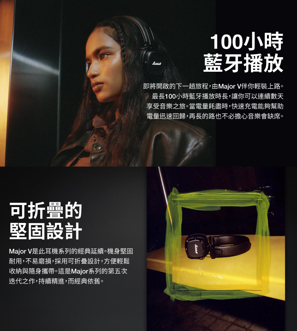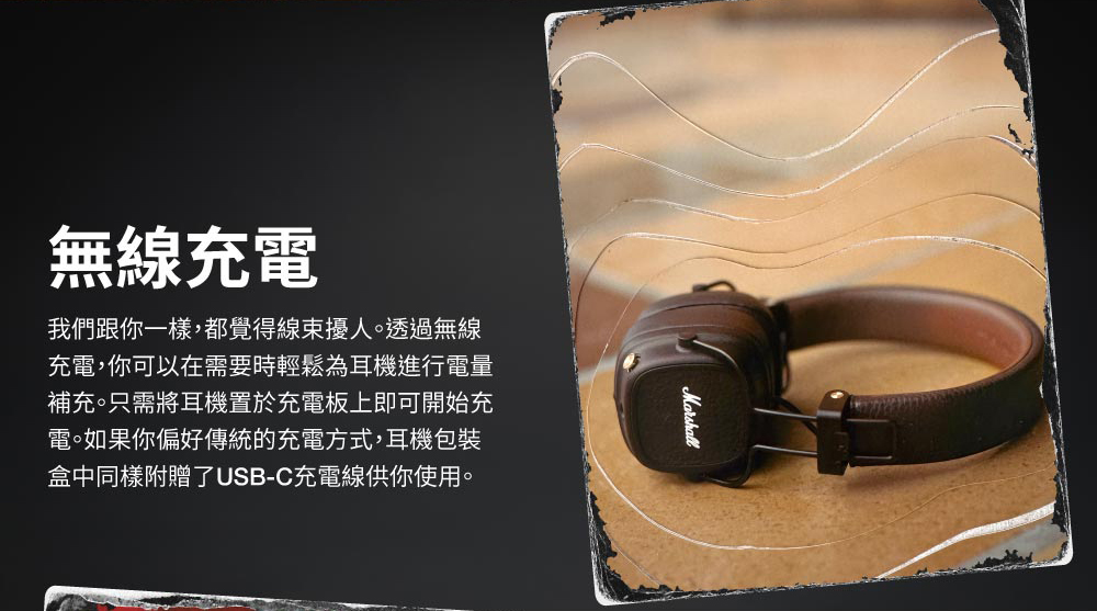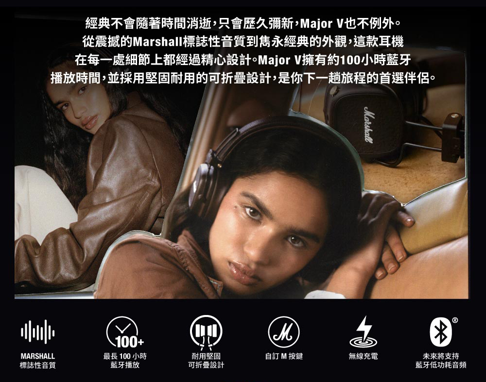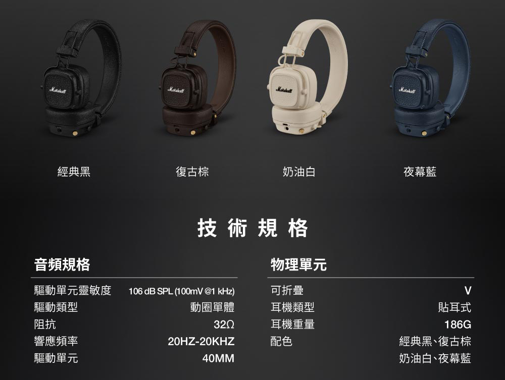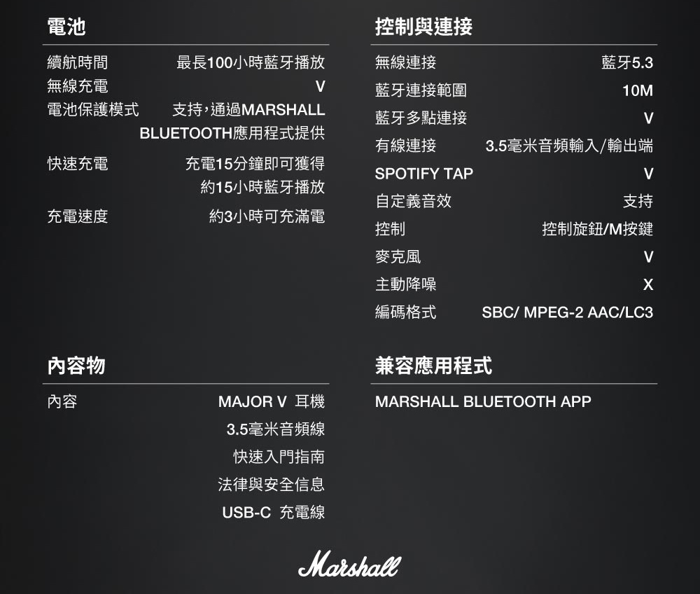 *商品規格:■型號:Marshall Major V■保固:一年+到貨7日內線上登錄延長半年保固■產地:中國■貨源:公司貨■連接方式:藍牙5.3■藍牙連線距離 : 10m■驅動類型 :動圈單動■靈敏度 : Ω106 dB SPL (100mV @ 1kHz)■阻抗 : 32 ohm■響應頻率 : 20-20k Hz■快速充電︰快充15分鐘,可播放15小時電力,支援無線充電■配件/內容物:Major IV 藍牙耳機、3.5 mm 音頻線、快速入門指南、法律與安全信息、USB-C 充電線(不含無線充電盤)■尺寸:155 X 155 X 80 mm■重量:0.186公斤■NCC碼︰CCAJ23LP5320T3■BSMI︰R38900~2027.01.22*注意事項︰1. 此商品為影音相關之進口商品,拆封後無法以新品販售,故不做退換貨。開封後僅接受商品暇疪時之退貨或換發新品。2. 鑑賞期非試用期,若無商品暇疪要退換貨,退貨商品之包裝及內容物均須完整無破損無開封,方可申請退換貨,否則將酌收10%~30%整新費,回收之舊品將以打折之福利品再販售,不會再以新品重新販售,請客人多加注意及體諒!3. 建議客人在未確定品牌、款式型號、顏色、尺寸前,請先至實體店看實機並試聽,避免買賣雙方困擾。4. 產品顏色會因網頁呈現而有些許差異,以收到實品為準 。