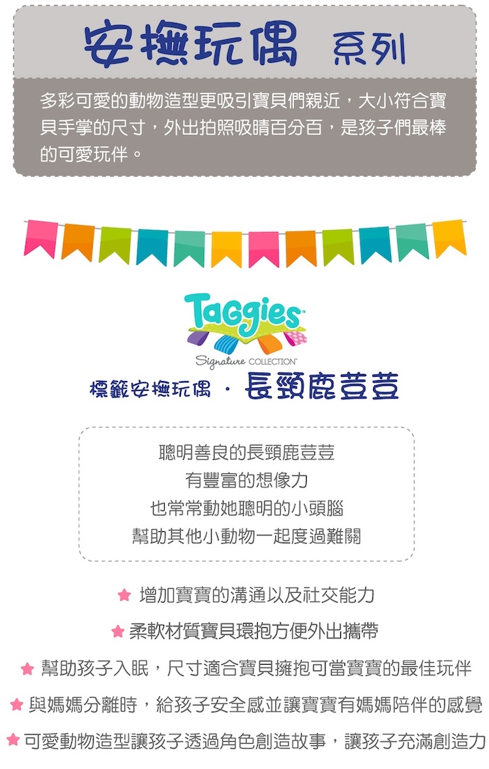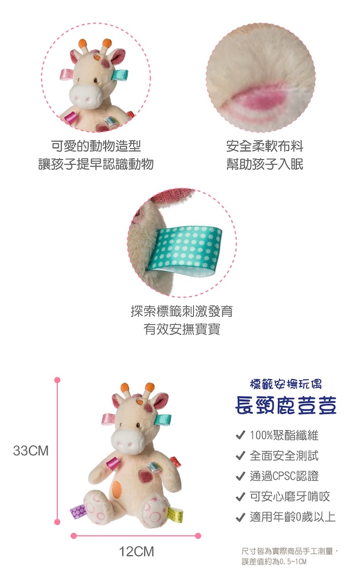 ●聰明善良的長頸鹿荳荳,有豐富的想像力,也常常動她聰明的小頭腦,幫助其他小動物一起度過難關。●毛絨又柔軟的玩偶陪伴寶寶,給予安全感。●許多彩色的緞帶標籤讓人愛不釋手。●探索標籤提供寶寶觸感的刺激。●刺激發育,有效的安撫寶寶。●安全柔軟布料,纖細柔軟不傷害寶寶柔嫩肌膚。