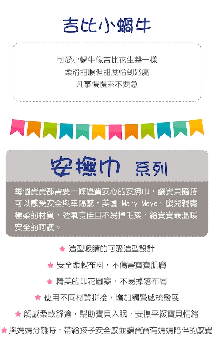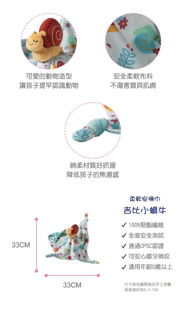 ●可愛小蝸牛像吉比花生醬一樣柔滑甜順,但甜度恰到好處,凡事慢慢來不要急●觸感柔軟且帶給寶寶安全感,陪伴寶寶讓他勇敢自行入睡●寶貝最愛打結的角落●矽膠材質的手把可當固齒器,讓寶寶口慾期不亂放東西在嘴巴,也可舒緩口腔不適●完美適合小手的尺寸易抓握,讓寶寶輕鬆訓練小手的肌肉●纖細柔軟不傷害寶寶柔嫩肌膚●不同的布料刺激觸覺,有效的安撫寶寶