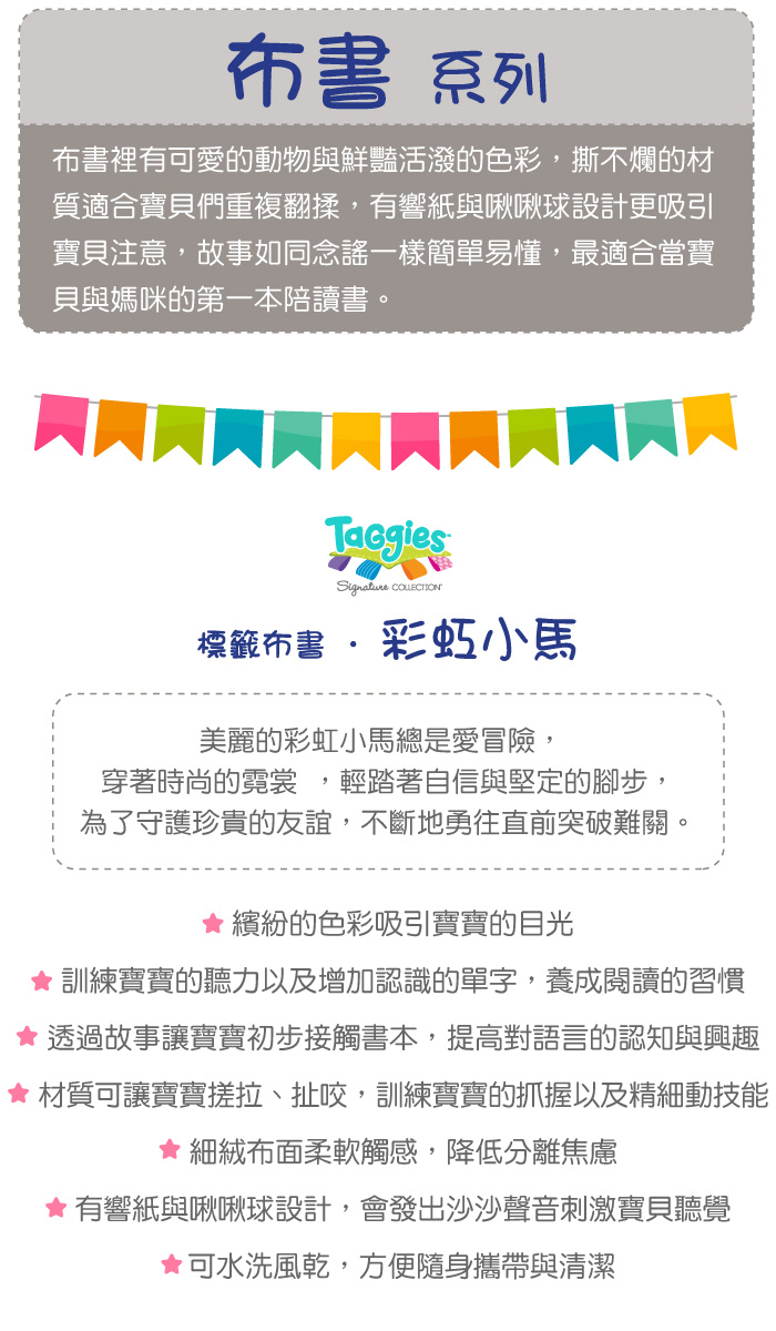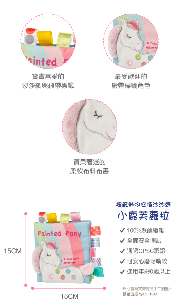 ●奶油色的小馬,搭配甜美、潮流的斑點、細緻的睫毛與絲質鬃毛,怎麼讓人不愛她呢!●全柔軟布料的布書●為寶寶與媽咪帶來微笑的8頁小故事●結合寶寶喜愛的沙沙紙●結合寶寶喜愛的緞帶標籤●吸引寶寶的注意力