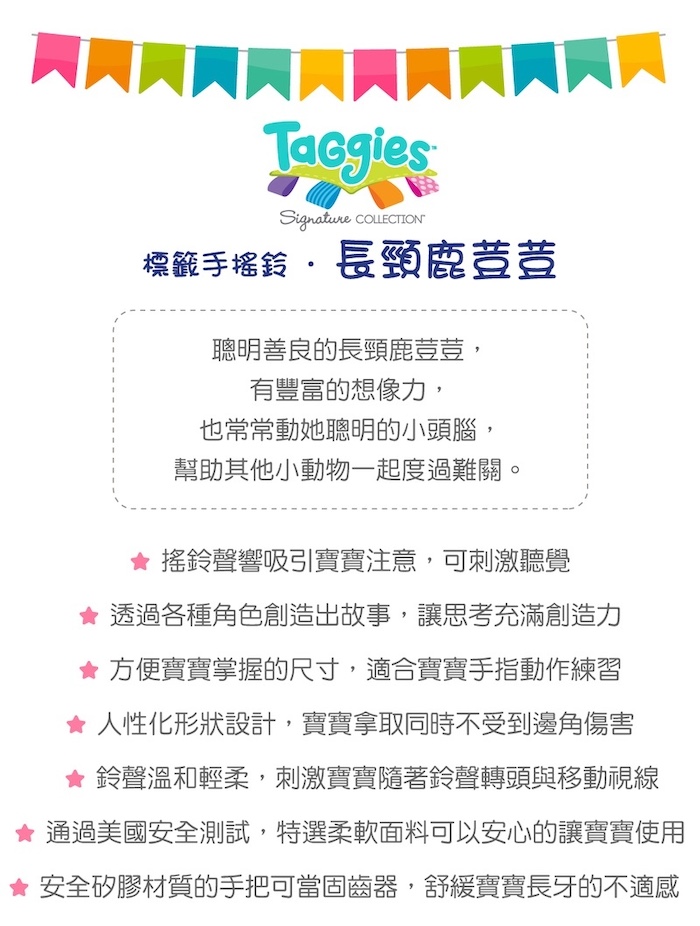 ●聰明善良的長頸鹿荳荳,有豐富的想像力,也常常動她聰明的小頭腦,幫助其他小動物一起度過難關。●矽膠材質的手把可當固齒器,讓寶寶口慾期不亂放東西在嘴巴,也可舒緩口腔不適。●完美適合小手的尺寸易抓握,讓寶寶輕鬆訓練小手的肌肉。●安全柔軟布料,纖細柔軟不傷害寶寶柔嫩肌膚。●搖鈴聲響吸引寶寶注意,可刺激聽覺,亦適合寶寶手指動作練習。