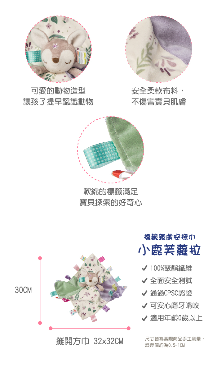 ●小鹿芙蘿拉-超萌的造型,搭配薰衣草與蕨葉的紋理毛絨,絕對是疼愛寶貝們的首選!●許多彩色的緞帶標籤讓人愛不釋手●造型吸睛的可愛造型設計●安全柔軟布料,觸感柔軟舒適●纖細柔軟不傷害寶寶柔嫩肌膚●探索標籤提供寶寶觸感的刺激