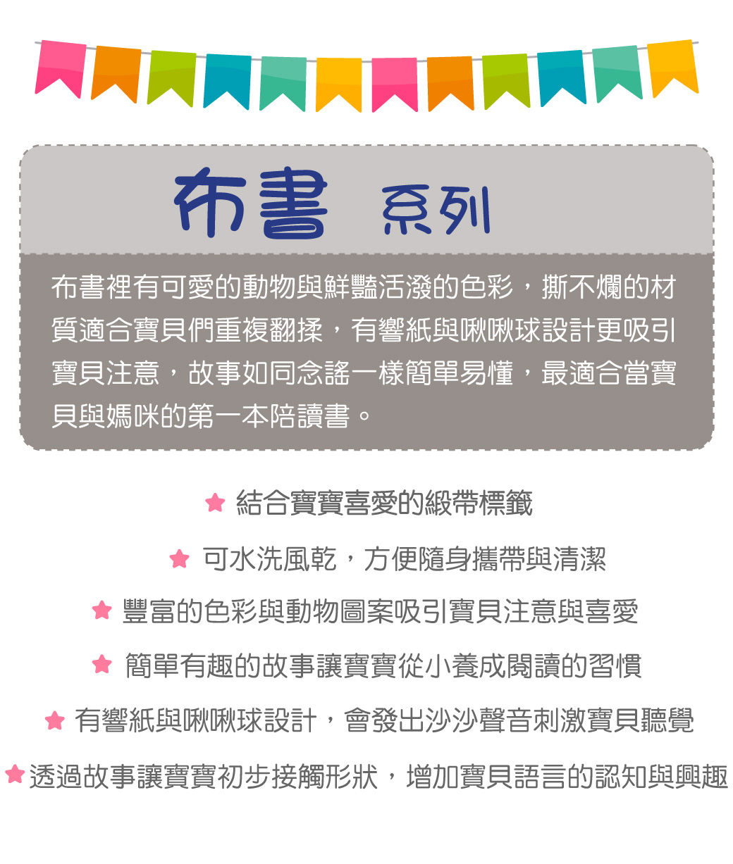 ●觸感柔軟且帶給寶寶安全感,陪伴寶寶讓他勇敢自行入睡。●探索標籤提供寶寶觸感的刺激。●布書為寶寶與媽咪帶來微笑的8頁小故事●搓揉布書會有喀擦喀擦的觸感跟聲音,吸引寶寶的注意力
